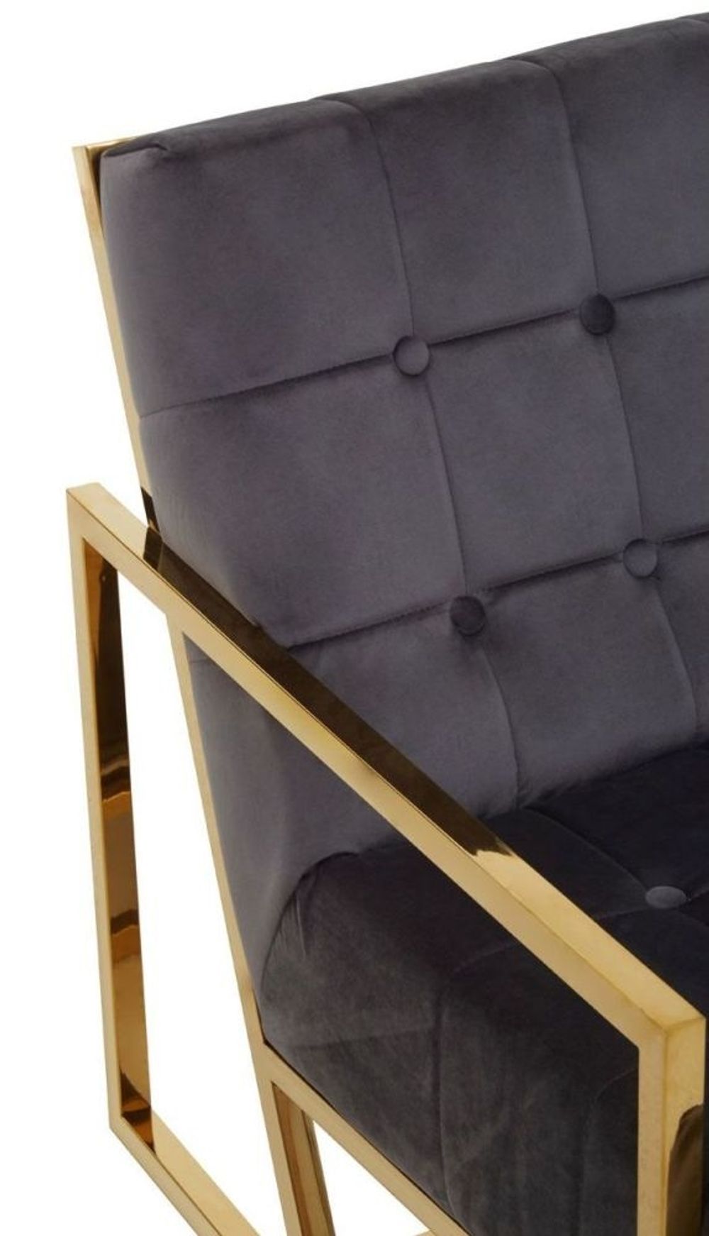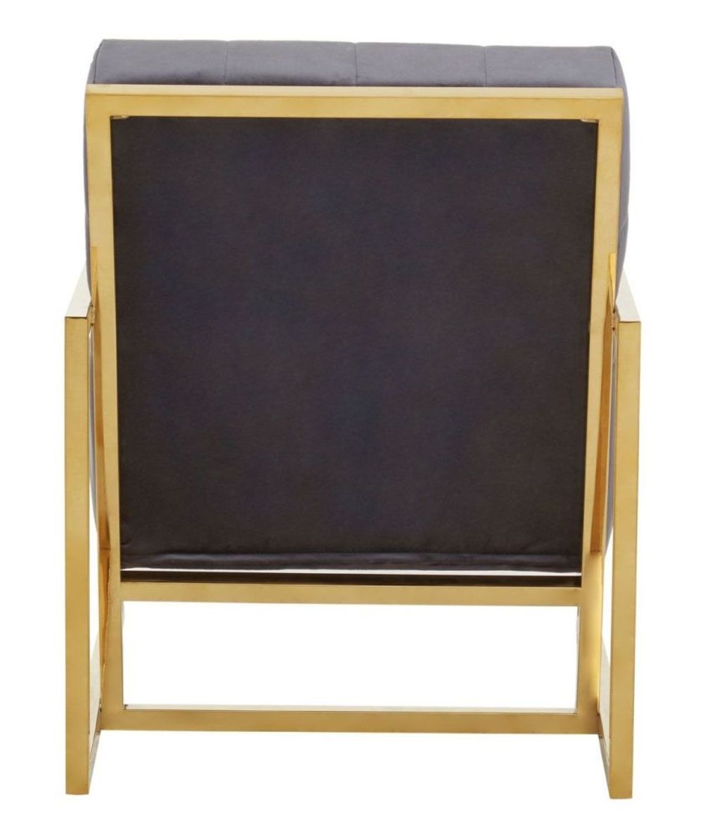 Item Code: 5528322 Boasting a striking gold stainless steel frame, detailed button tufting that highlights striking tones of grey velvet. The chair elevates decor with its glam aesthetic, sleek profile, tested durability, functionality and ergonomic support.