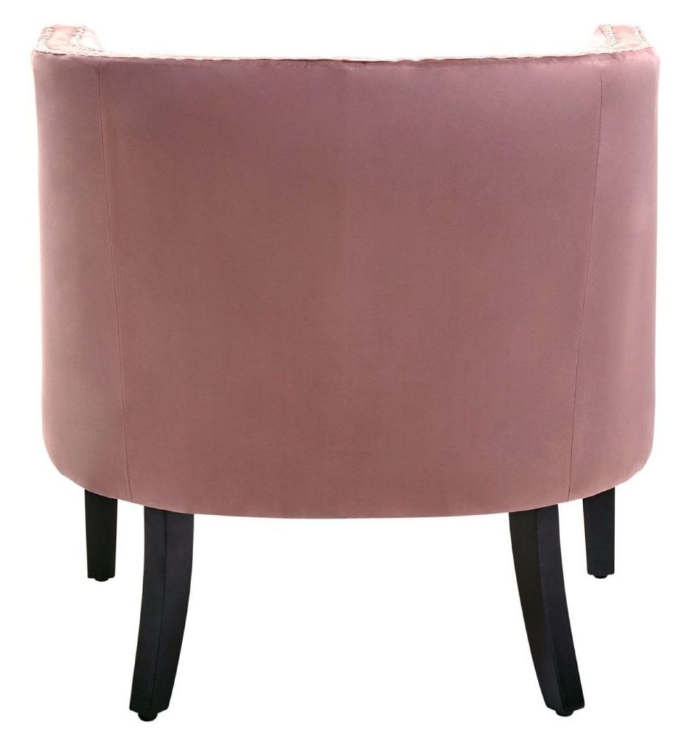 Item Code: 2406332 Larissa pink velvet studded chair with black rubberwood legs.This densely foam-padded chair exhibits gliding armrests with studded detail. Upholstered in sumptuous pink velvet, this chair boasts clean-lined stitching and sits atop a black rubberwood base which adds support with style.