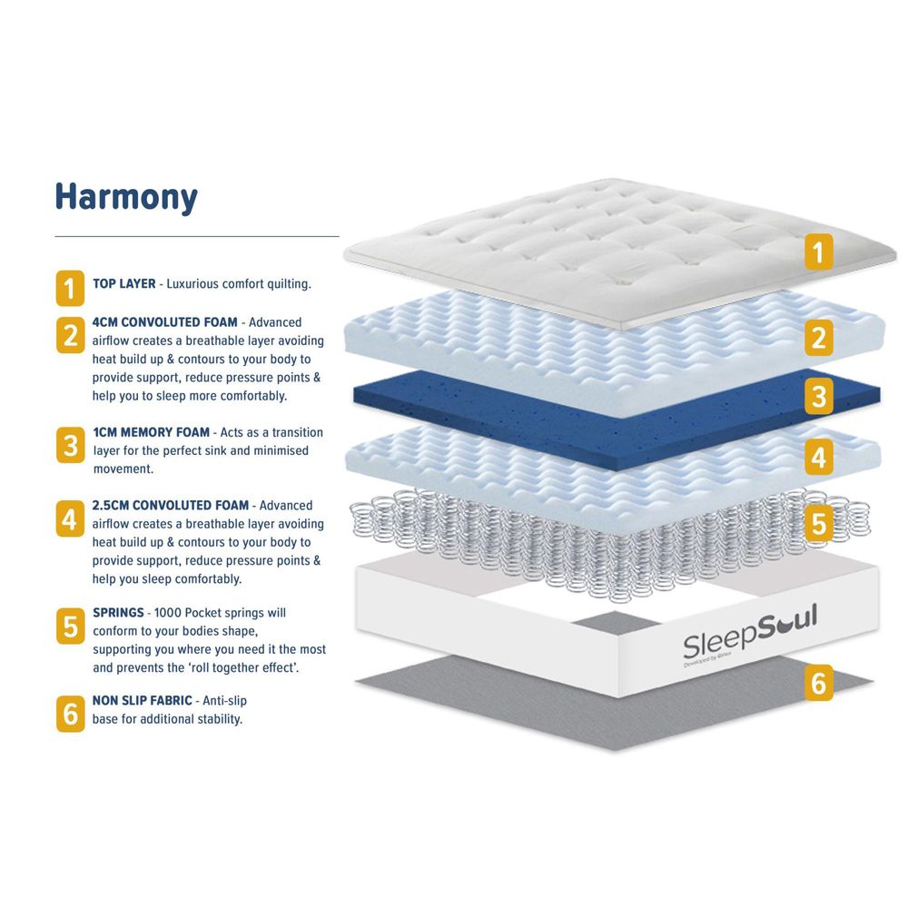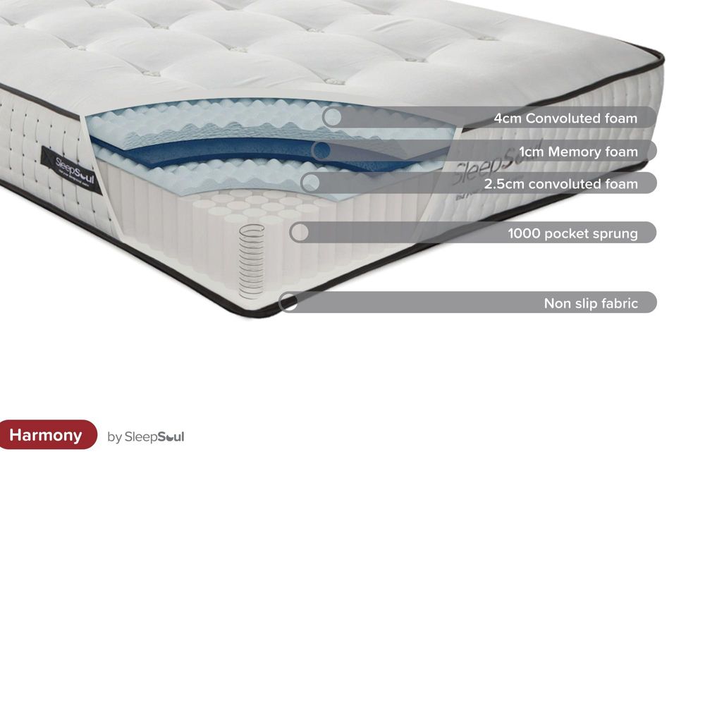 The SleepSoul Harmony mattress combines memory foam and convoluted foam to help you drift into a deep, restful sleep. Featuring 4cm of convoluted foam, 1cm of memory foam and another 2.5cm of convoluted foam, the SleepSoul Harmony mattress has to be felt to be believed. The convoluted foam is a breathable layer that provides advanced airflow for a cooler night's sleep. It also reduces pressure off joints and muscles. The 1cm layer of memory foam allows your body to sink deep into the mattress, offering comfort and stability unlike traditional foam. Experience a blissful night's sleep without fear rolling off the bed. 1000 individual edge-to-edge pocket springs keep you stable and supported as you sleep. You'll avoid the 'roll-together' effect, keeping you and a partner secure on the bed for a more peaceful night's sleep. The Harmony mattress is vacuum sealed and packed into a box for freshness and convenience. Just release from the box, remove the inner plastic wrap and, like magic, watch as your new mattress begins to take shape. In 2 hours, it will be good in 48hours, it will be great. Each SleepSoul pocket-sprung mattress comes with a 10-year warranty as standard, so you can enjoy a decade of good sleep.This is a Made to Order itemAll Made to Order items are manufactured as per the order supplied by you.We are unable to accept cancellation or accept any extra cost that may incur due to wrong information provided by you at the time you placed the order.We will confirm all sizes/colours/finishes in written email (order confirmation) with you before going ahead with production of your order.