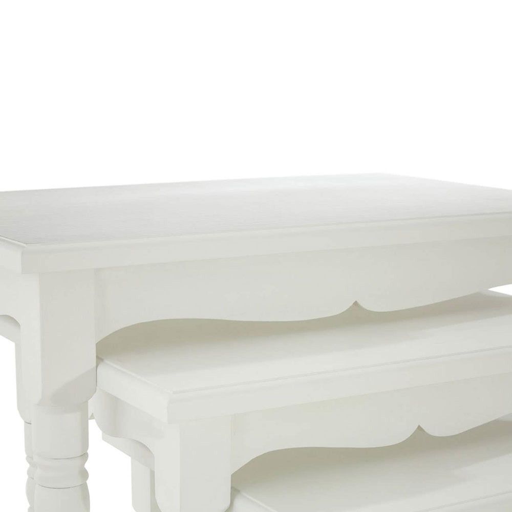 Item Code: 5501286 Each of the three Hendra nesting tables feature undulating skirting and slim, knopped legs.The crisp white finish helping to accentuate each carve and curve. Created from environmentally friendly paulownia wood, the small and medium nest cosily under the large. Display them as part of a traditional Shaker-inspired interior design setting.