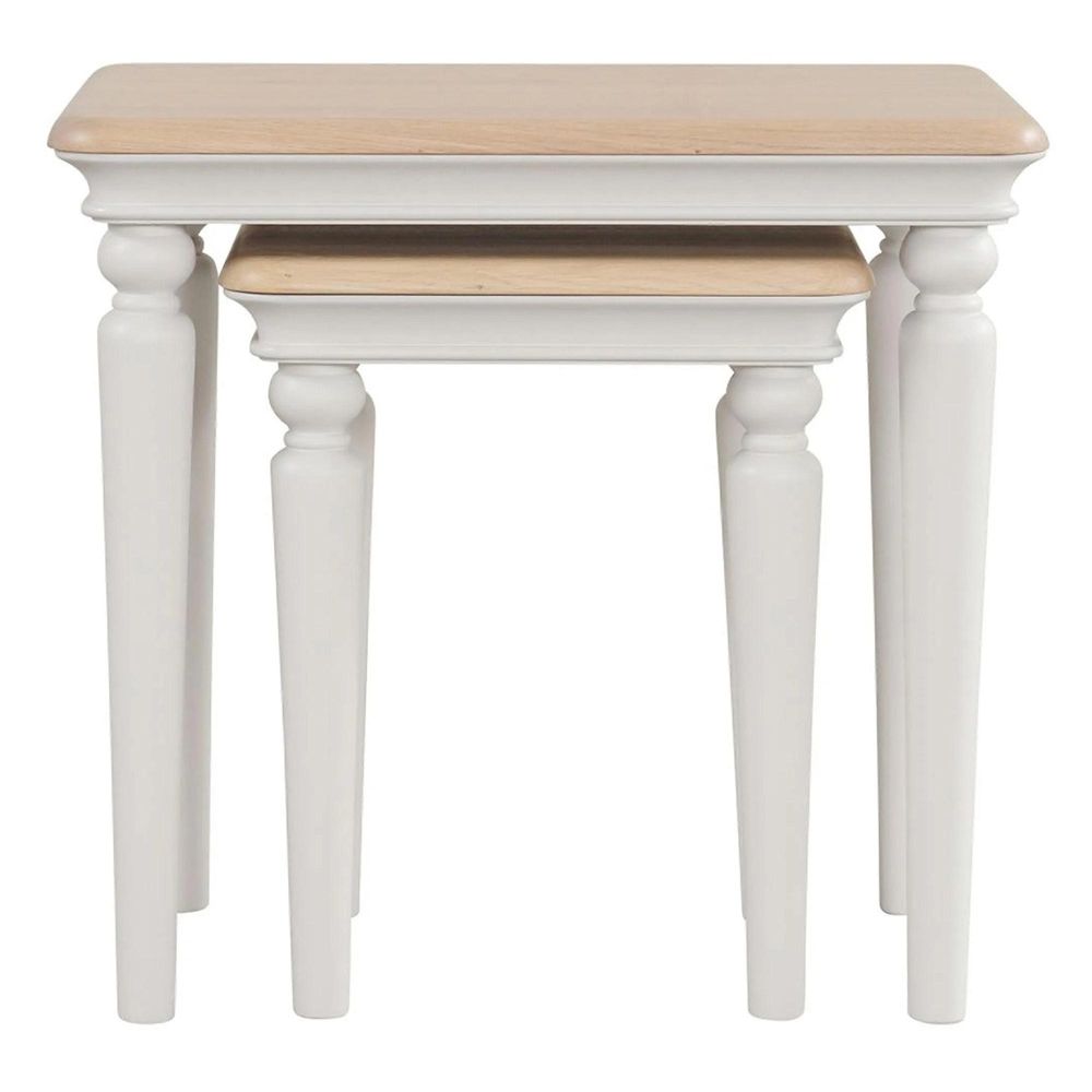 Beautifully crafted with turned legs, a painted finish, and solid oak tops, this nest of two tables brings versatility and charm to your living area. Use them together or apart perfect for entertaining, serving drinks, or creating extra surface space whenever you need it, then neatly nest them away.