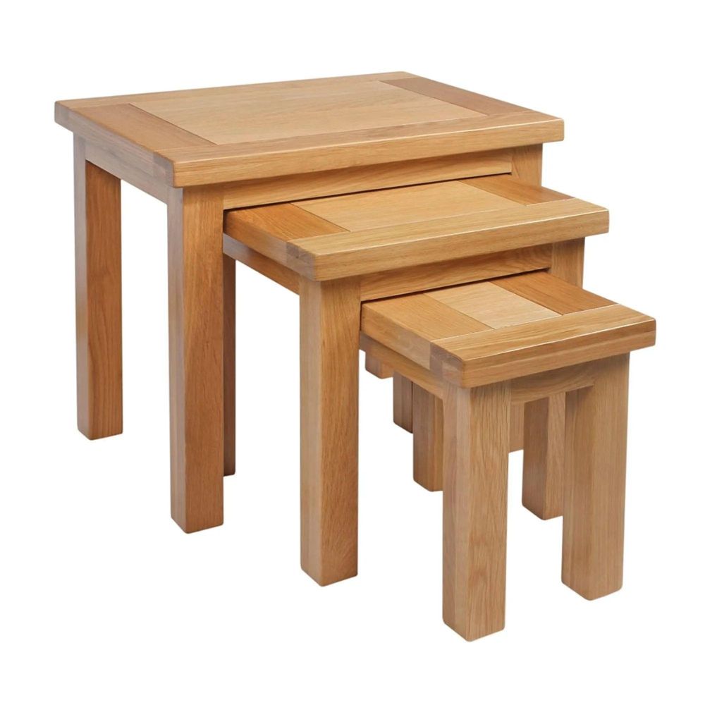 Bring timeless charm and practicality into your living space with the Appleby Oak Nest of 3 Tables. Expertly crafted from solid oak and finished with a light protective lacquer, this versatile set is designed to combine elegance with everyday function. With clean straight lines and beautifully styled panels, these natural wooden tables showcase the fine grain and warm tones of oak, making them a classic addition to both traditional and modern homes.