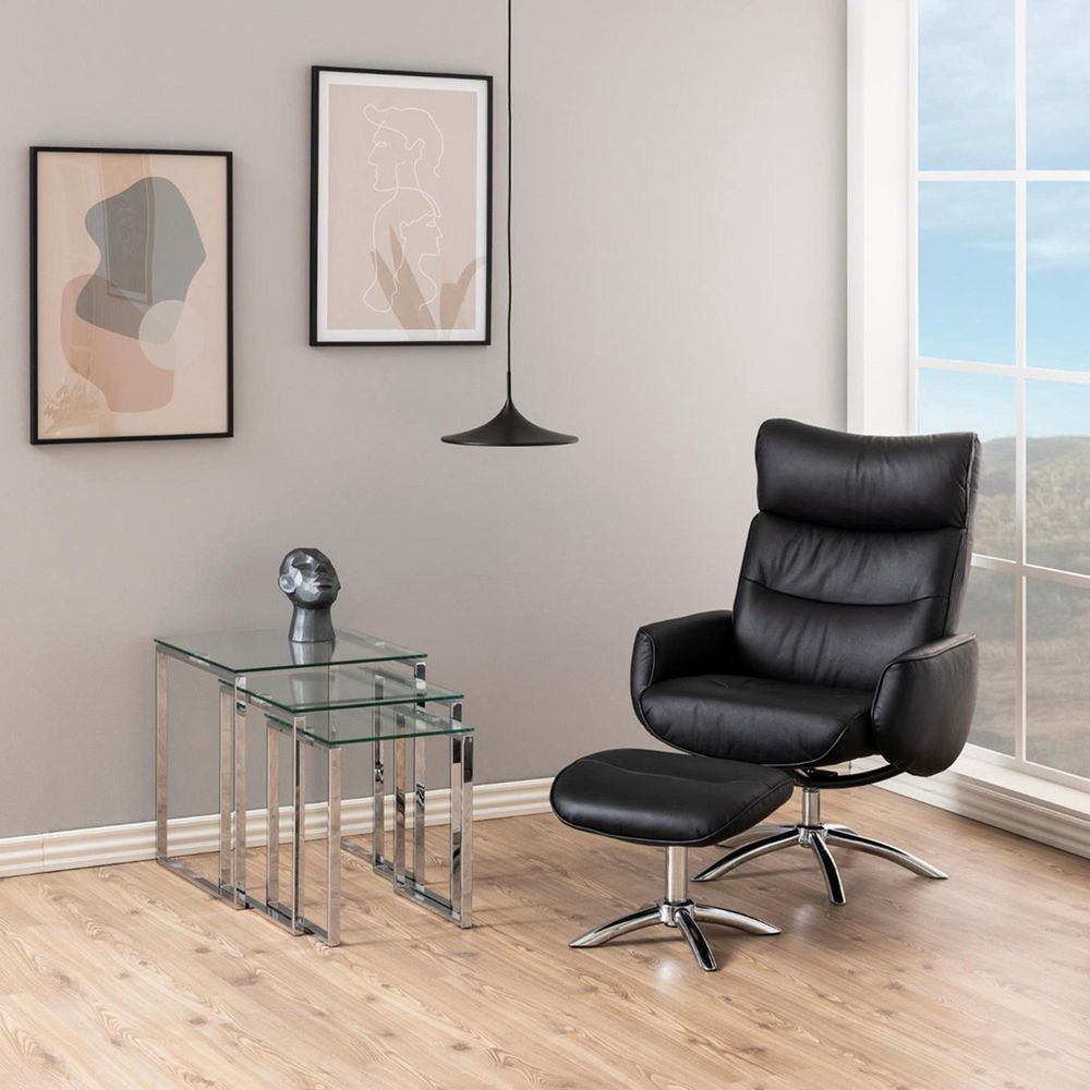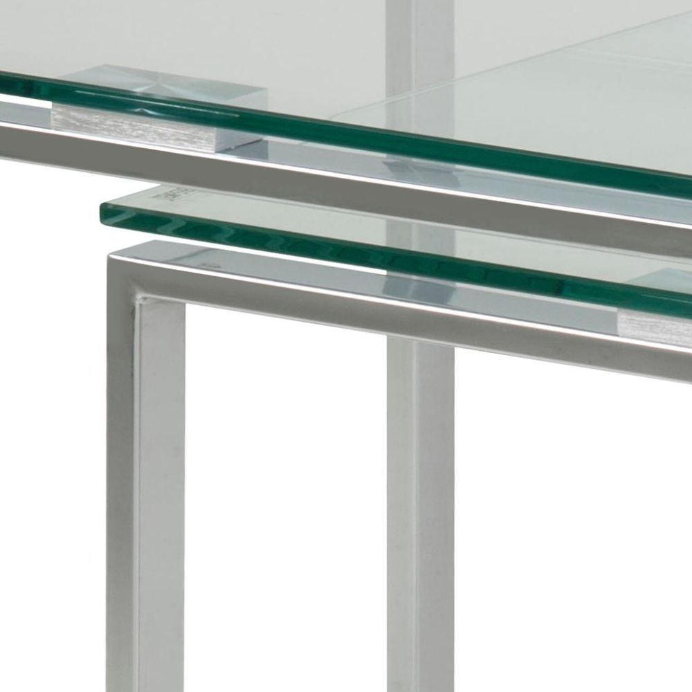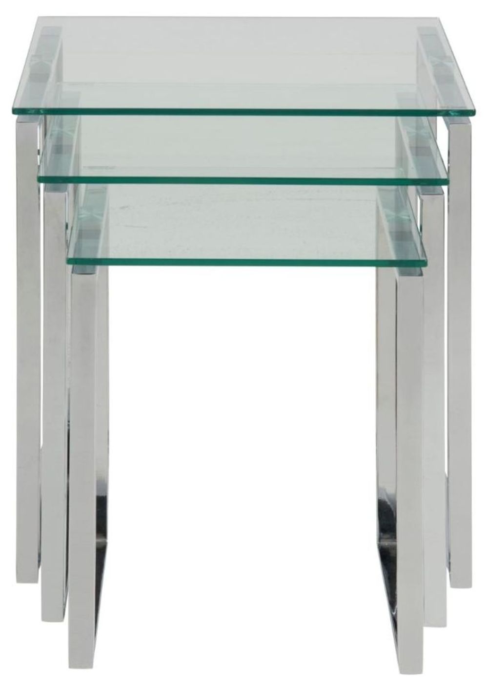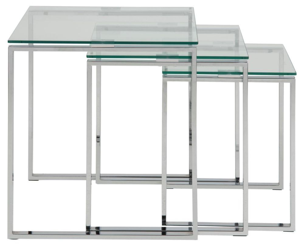 Item Code: 51092 This stylish set of three tables offers a sleek, contemporary look in any living space. The sleek clear glass tops, finished with grey, chrome metal frames, are perfect for both display and storage. Perfect for when extra surfaces are needed, the three nesting tables fit together easily and are light enough to move around your home as desired.