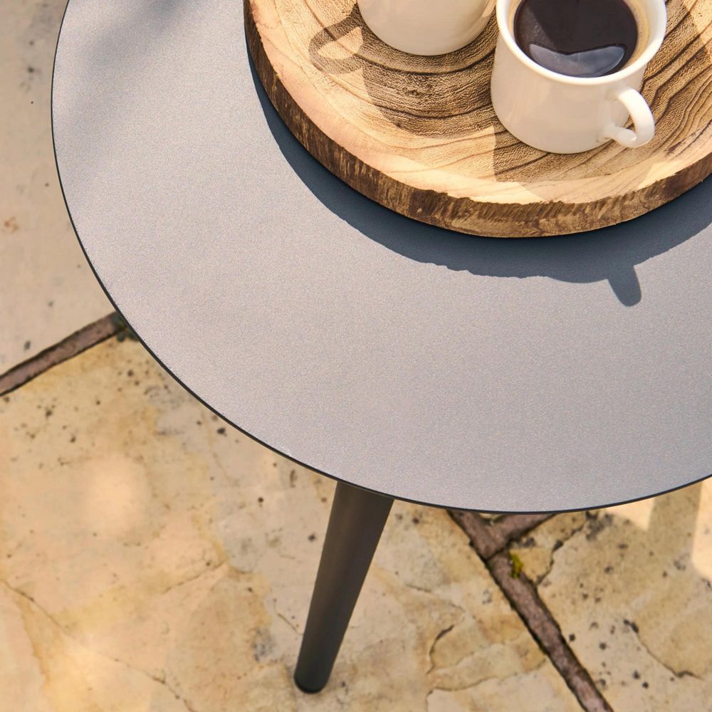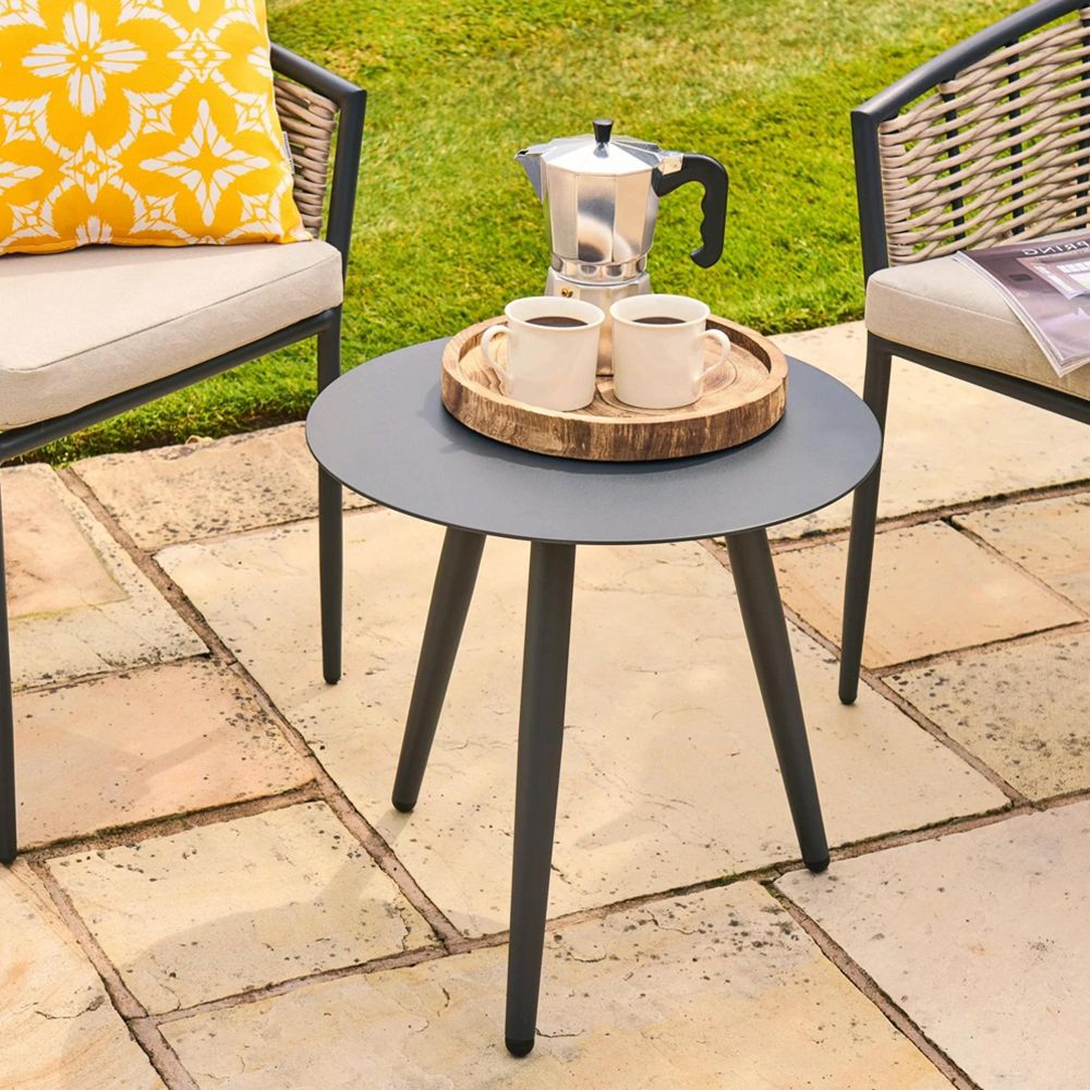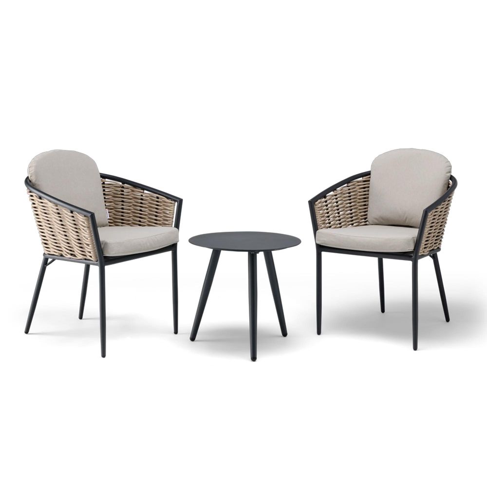 Perfect for patios, balconies, or cosy garden corners, the Pavilion Bistro Set for Two brings a touch of modern elegance to outdoor dining. This compact yet stylish set includes a round bistro table and two matching chairs, crafted from a durable aluminium frame and hand-woven rattan for a contemporary finish. The light grey polyester cushions add comfort and charm, making this set ideal for morning coffees, evening drinks, or intimate alfresco meals.