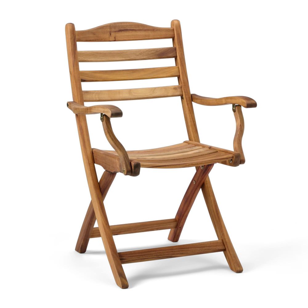 Simple, space-saving, and beautifully crafted, the Redcliffe Folding Carver With Arms is a versatile seating option for any outdoor setting. Made from solid Acacia hardwood, it features a warm golden-brown tone and naturally attractive grain. Each chair is hand-sanded and finished with a smooth oil coating, giving it a refined sheen and added protection against the elements. Its armless design offers a more streamlined silhouette, making it ideal for pairing with dining tables or using as occasional seating. The folding mechanism allows for easy storage and portability perfect for flexible outdoor living.