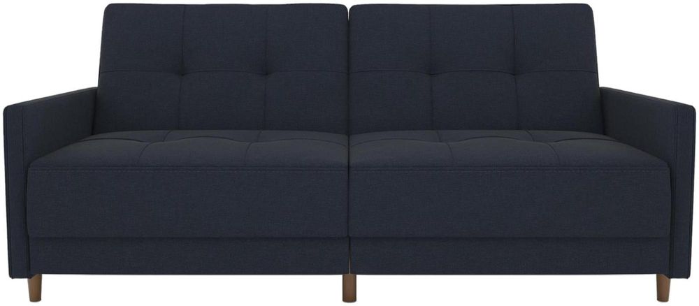 The mid-century modern look is making a comeback in a big way, and we’ve captured it all here for you in our stunning Anderson coil futon. The tufted upholstery gives this futon its unique charm, available in your choice black or white faux leather, as well as in grey or navy blue linen—perfect to fit your home’s décor! Plus the sleek wooden legs add to the sofa’s style, with centre legs designed to provide extra stability. The sofa’s secret is its split-back design that allows guests to adjust their angle of comfort. So you can each sit up, lounge back or open up the space to lie flat. The independently encased coils are designed to offer complete comfort by day and extra support at night when your futon opens up for overnight guests. The Anderson is small enough for tight living spaces while providing you with big style and comfort!• Mid century modern design. Upholstered back with wood Legs.• Multi-functional piece ideal for small living spaces.• Made with pocket independently encased coil seating for additional comfort.• Center leg for additional support• Converts easily from couch to sleeper.