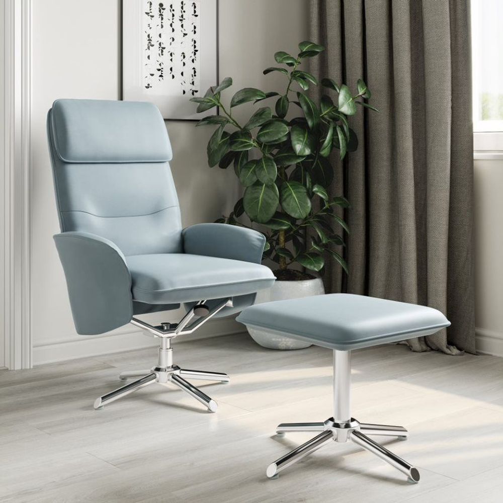 Item Code: ARC7760GRY The Belding is a stunning contemporary reclining chair complete with matching footstool. The light grey faux leather finish sits beautifully with the striking chrome base, combining to give a light spacious feel to any room. The Belding features a comfortable reclining mechanism, complete with tension control and 360 spin.