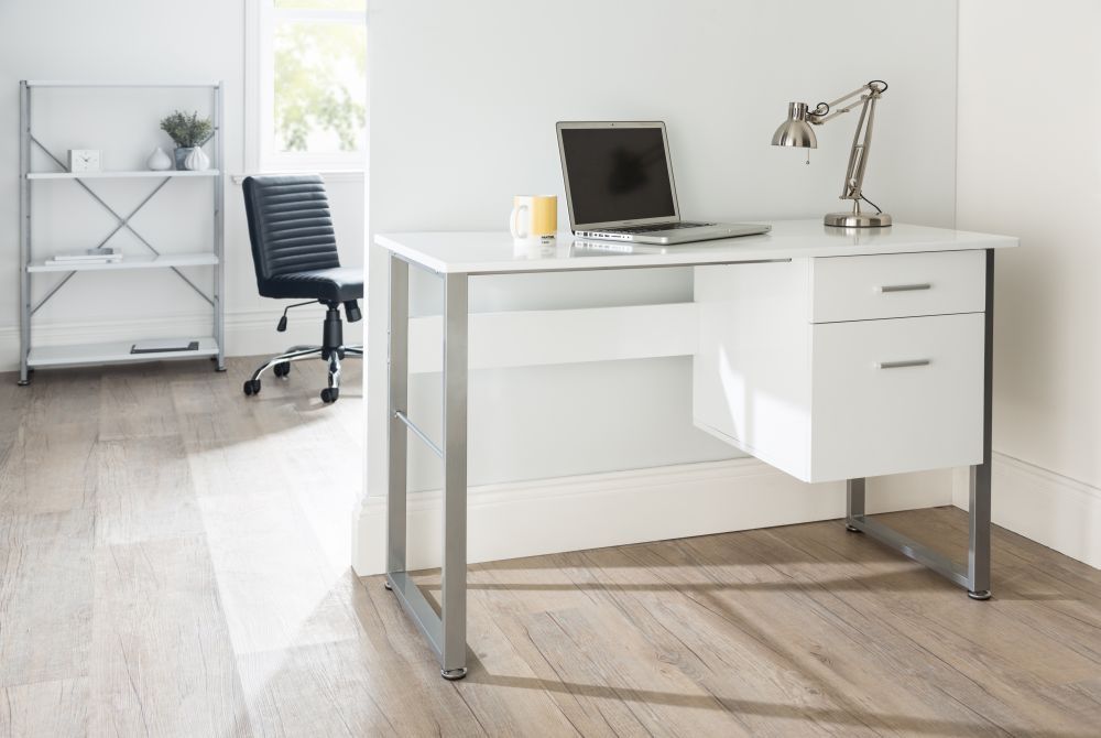 Item Code: AW22226-WH The Cabell is a modern desk made from beautiful white painted wood with a complimenting grey frame. Its sturdy design includes a floating pedestal featuring stationery and filing drawers finished with matching handles. The frame is complete with adjustable feet for perfect levelling.