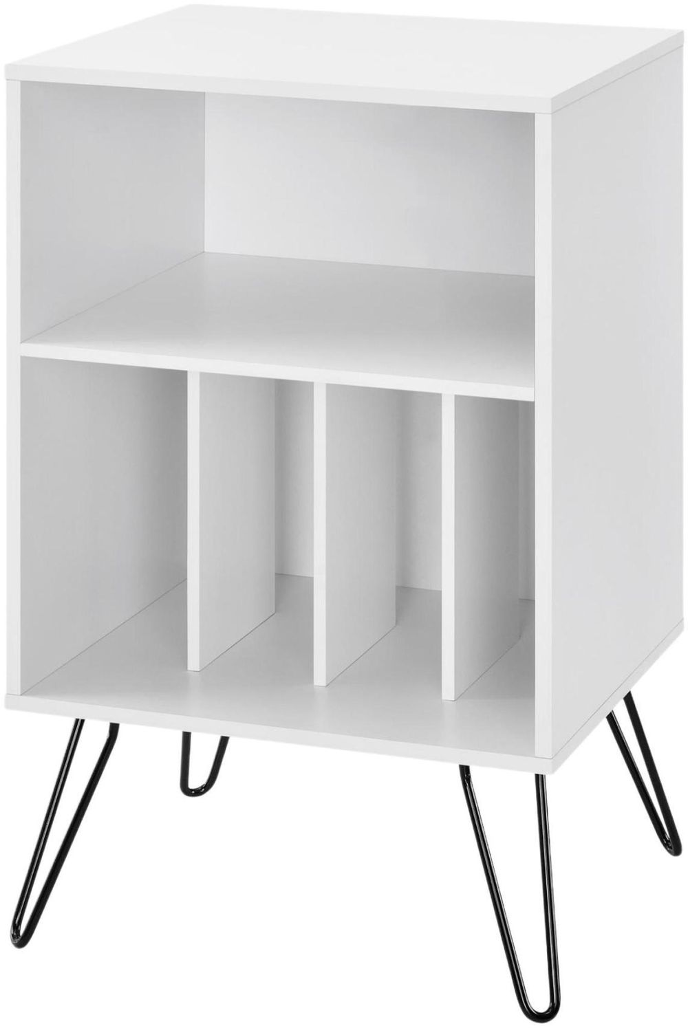 Give your living room or entertainment space a retro look with the Novogratz Contra Turntable Stand. Inspired by mid-century design, the clean, white laminated particleboard and MDF give the Stand a sturdy build that will last for years while the contrasting black metal hairpin legs add a retro twist. The Stand is the perfect size to place your record player and the open cubbies offer plenty of options to keep your albums organized. You can store them upright in the 4 lower cubbies or keep your favorites at the top in the large upper cubby. The Novogratz Contra Turntable Stand ships flat to your door and requires assembly upon opening. Two adults are recommended to assemble. The Stand can hold up to 30 lbs. and the large cubby will hold 25 lbs. Each smaller cubby will hold up to 5 lbs. Once assembled, the Stand measures to be 34.1”H x 20.7”W x 18”D.• Take it back in time with the Novogratz Contra Turntable Stand• The clean, white laminated particleboard and MDF offer a strong build while the mid-century inspired black metal hairpin legs add a fun, retro look• The Stand is the perfect size to place your record player and keep your albums organized in the 4 lower cubbies or keep your favorites at the top in the large upper cubby• Complete your collection with other Novogratz items (sold separately)• The Novogratz Contra Turntable Stand ships flat to your door and 2 adults are recommended to assemble. The Stand can hold up to 30 lbs. and the large cubby will hold 25 lbs. Each smaller cubby will hold up to 5 lbs. Assembled dimensions: 34.1”H x 20.7”W x 18”D