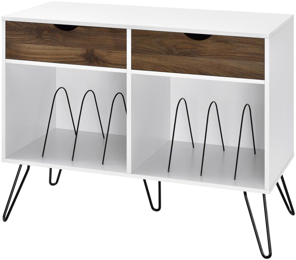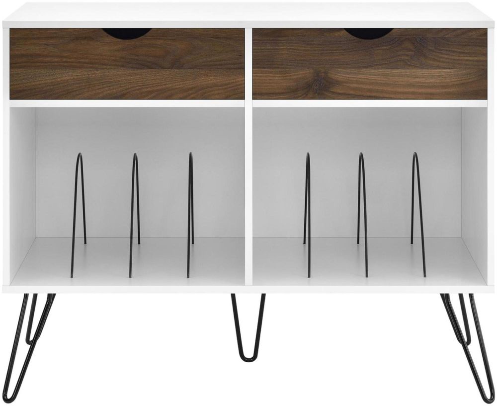 Add a blast from the past with the Novogratz Contra Turntable Stand with Drawers. Inspired from mid-century design, the laminated particleboard and MDF complement the black metal hairpin legs for a fun retro look. The white chassis and contrasting medium brown woodgrain drawer fronts pair well with any décor from modern to classic. The double wide stand offers plenty of space to place a record player, speakers, and stereo or even decorations. Keep your remotes, cassette tapes, and record mats or weights for your singles stored away and organized in the 2 drawers. The drawer cutout gives the stand a clean, no-handle look that is easy to open. Keep all of your albums organized in the large open cubbies that feature metal record dividers to keep all of your albums upright. The Novogratz Contra Turntable Stand with Drawers ships flat to your door and 2 adults are recommended for assembly upon opening. The Stand can hold up to 60 lbs. while the cubbies will hold 20 lbs. each. Each drawer can hold up to 15 lbs. Upon assembly, the Stand measures to be 31.8”H x 39.7”W x 18”D.• Take it back in time with the Novogratz Contra Turntable Stand with Drawers• The white laminated particleboard and MDF chassis offer a strong build that complements the mid-century inspired black metal hairpin legs. The contrasting medium brown woodgrain drawer fronts give the Stand a classic look to add to any style• The double wide Stand offers plenty of space for a record player, speakers and stereo and features 2 large open cubbies with metal dividers to keep your albums upright and organized. Keep your remotes, cassette tapes, and record mats or weights stored away in the 2 spacious drawers• Complete your collection with other Novogratz items (sold separately)• The Novogratz Contra Turntable Stand with Drawers ships flat to your door and 2 adults are recommended for assembly. The Stand can hold up to 60 lbs. while the cubbies will hold 20 lbs. each. Each drawer can hold up to 15 lbs. Assembled dimensions: 31.8”H x 39.7”W x 18”D