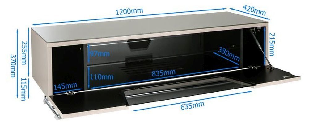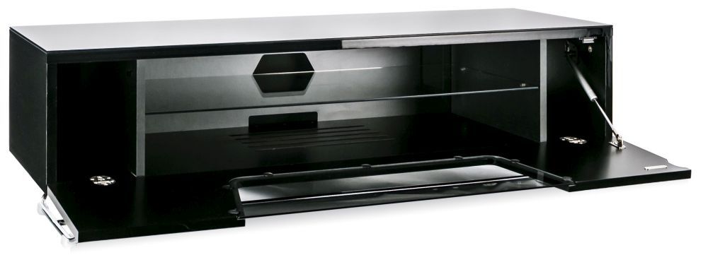 Item Code: CRO2-1200CB-BLK Featuring a coloured high gloss finish clad in matching glass and supported by a discreet steel frame, the Conway range of TV stand epitomises contemporary furniture designs. The flip down door is complete with IR friendly glass, soft opening hinge and magnetic catch, and holds a toughened glass shelf and 2 storage compartments.