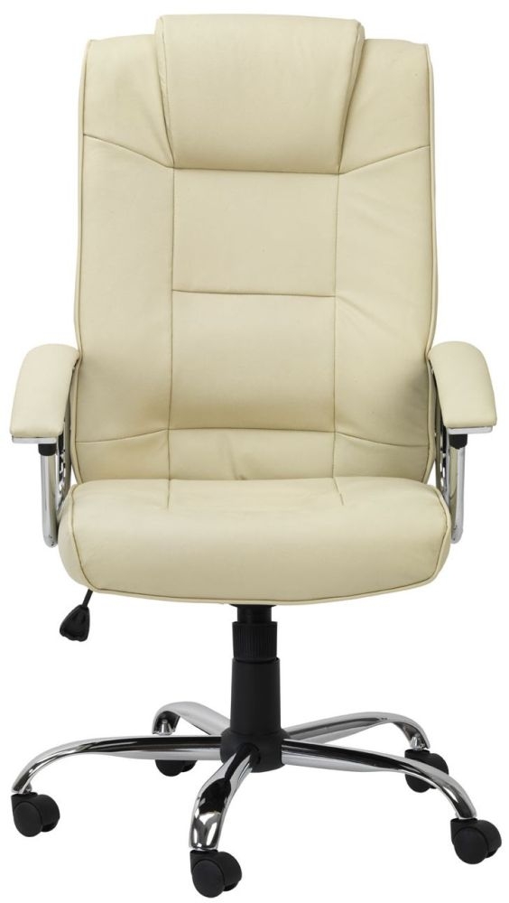 Item Code: AOC4201A-L-CM A leather faced executive chair with a high backrest and pronounced lumbar support. It features a gas lift, fully reclining tilt mechanism that is adjustable for individual body weight and contemporary chrome leather armrests for additional support. Perfect for comfort, and ideal for your home office.