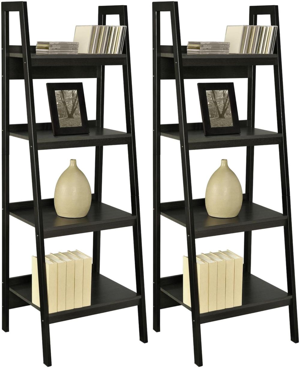 If you need more room to store your books, the Ameriwood Home Laurens 4 Shelf Ladder Bookcase Bundle is just for you. With 2 ladder-style bookcases boasting 4 shelves each, this set is great for adding more vertical storage to your living room, bedroom or office space. Made from laminated MDF and particleboard, the shelf features a black finish with a powder-coated black metal frame for a sleek, modern look. In order to protect your floors from scratches, the shelves come with plastic foot caps. The Bookcases ship flat to your door and require assembly upon opening. Two adults are recommended to assemble. Once assembled, the each Bookcase measures to be 60”H x 20.5625”W x 18.5”D.• Place the 2 ladder-style bookshelves in the Ameriwood Home Laurens 4 Shelf Ladder Bookcase Bundle side by side or in different rooms for coordinated décor• Each ladder has 4 shelves that can hold books, binders, decorations or knickknacks• With a sleek black finish, the shelves are constructed from laminated MDF and particleboard with a powder-coated metal frame to fit seamlessly into any modern décor• Complete your room with other items from the Laurens collection for a coordinated look (sold separately)• The Bookcases ship flat to your door and 2 adults are recommended to assemble. Each shelf can hold up to 30 lbs. Assembled dimensions of each Bookcase: 60”H x 20.5625”W x 18.5”D