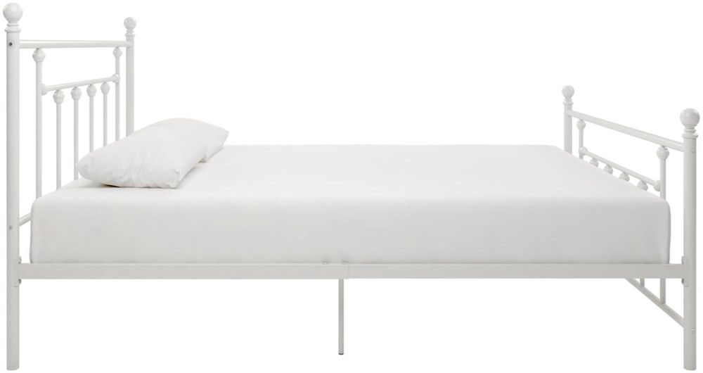 Metal beds are all the rage now—and you can see why. The Melton metal bed not only commands attention, it also offers the perfect balance of modern sophistication and Victorian detailing, combining straight lines with rounded finial touches for a look you’ll love for years to come. The solid metal slats are designed to provide ample support and durability and allow air to circulate under the bed to help keep your mattress fresh for longer. It also means no box spring is needed! The sturdy legs and extra centre support further add structural strength to help you get a great night’s sleep. The Melton bed frame is available in stunning white, reflective bronze, gold and millennial pink and in your choice of various sizes—so this luxurious bed will fit seamlessly into your space and colour scheme.• Sturdy metal frame• Modern design with Victorian style finial detailing• Metal slats offer support and durability. Metal slat base allows air to pass freely beneath your bed, keeping your mattress fresher longer• Available in twin, full queen and king size, white, gold, millennial pink or reflective bronze metal• Accommodates any standard twin, full or queen size mattress, sold separately