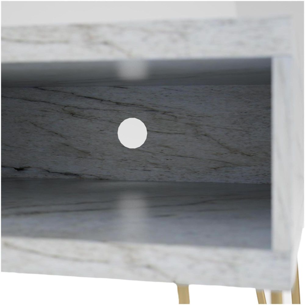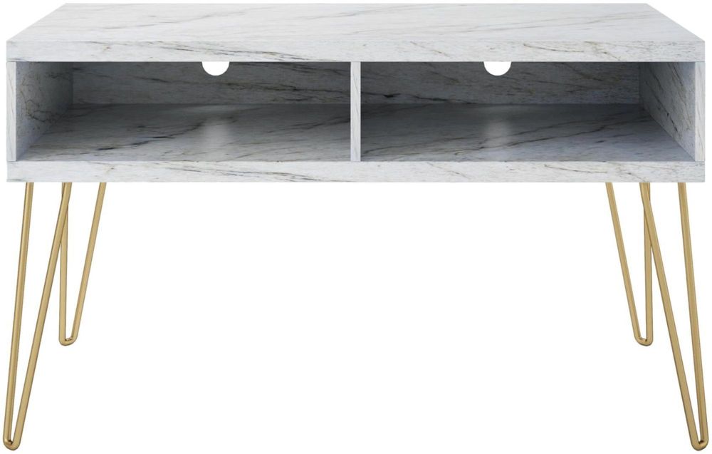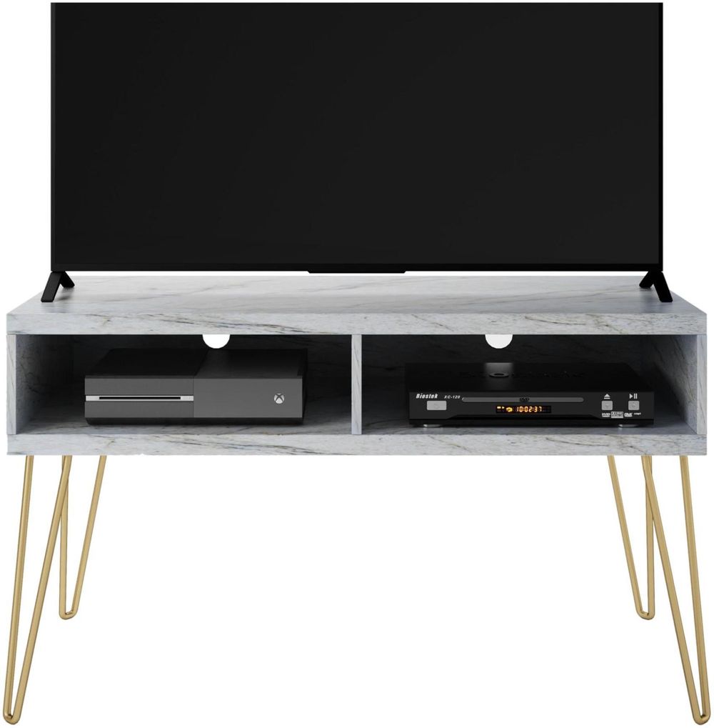 Modern, glam and industrial styles all come together in the Nowata Athena TV Stand for TVs up to 42” wide or 50 lbs. This simple yet stylish TV Stand made of PVC laminated particleboard has a slim design ideal for smaller spaces and features a faux white marble finish for an instant upgrade to your space. Place a 42” flat screen TV on the top surface while you house the DVD player, cable box and remotes in the 2 cubbies below. The wire management holes make plugging in all of your devices simple. Supported on gold hairpin-style metal legs, this TV Stand boasts a mid-century design retro enthusiasts will love. The TV Stand ships flat to your door and 2 adults are recommended for assembly. Once assembled, the Stand measures to be 24.6"H x 42"W x 19.7"D.• Give your living room a stylish upgrade with the Nowata Athena TV Stand for TVs up to 42” wide or 50 lbs• Made of PVC laminated particleboard, the TV Stand features a faux white marble finish with gold metal hairpin legs for a mix of retro and glam styles you will love• Place your DVD player, gaming system, and cable box in the 2 open cubbies that offer wire management holes to keep your cords tangle free• Complete your space with the entire Athena collection for a coordinated look (each sold separately)• The TV Stand ships flat to your door and 2 adults are recommended for assembly. Each cubby can hold up to 33 lbs. Assembled dimensions: 24.6"H x 42"W x 19.7"D