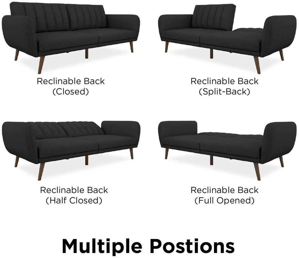 Be embraced by the comfortable cushioning of the Nowata Brittany Futon. With its ribbed tufted cushioned back, the Nowata Brittany Futon gives your body all the support you need to sit and relax for hours. The combination of curved armrests and slanted legs work together to provide a unique rounded look that stands out. The stylish upholstery adds another element of elegance making this a perfect statement piece for any living space. Designed with a multi-position split-back, the Brittany independently converts between a sitting, lounging and sleeping position with an easy push and pull motion. The futon is also equipped with extra bag legs that provide extra support for your overnight guests when in a sleeping position. Available in multiple trendy colors that will either add a pop of color to your space or provide a neutral statemen piece to build your décor around. Pair with the rest of the Brittany collection to get the complete look!• Stylish linen upholstery wipes clean easily• Ribbed tufted cushioned back with slanted oak coloured wooden legs• Sturdy wood frame construction that is stable and durable• Comfortable polyester and foam filling• Futon Dimensions: 81.5"L x 34.5"W x 31.5"H. Sleeper Dimensions: 70.5"L x 43.5"W x 16"H. Weight Limit: 600 lb.