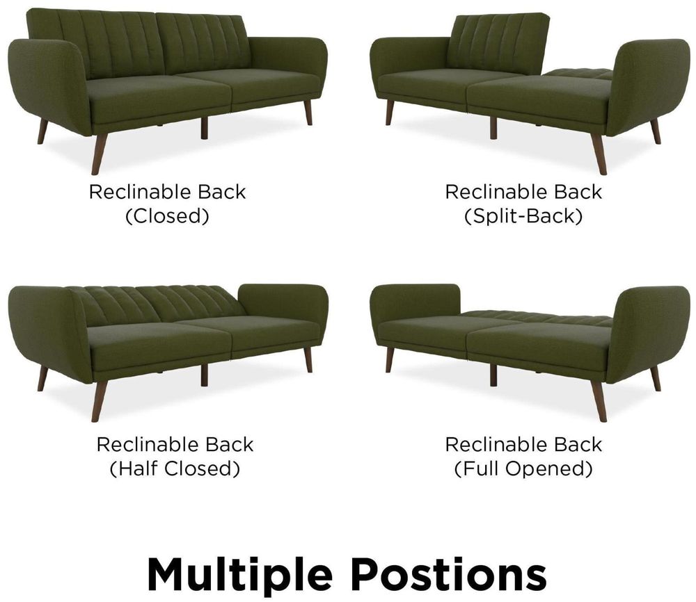 Be embraced by the comfortable cushioning of the Nowata Brittany Futon. With its ribbed tufted cushioned back, the Nowata Brittany Futon gives your body all the support you need to sit and relax for hours. The combination of curved armrests and slanted legs work together to provide a unique rounded look that stands out. The stylish upholstery adds another element of elegance making this a perfect statement piece for any living space. Designed with a multi-position split-back, the Brittany independently converts between a sitting, lounging and sleeping position with an easy push and pull motion. The futon is also equipped with extra bag legs that provide extra support for your overnight guests when in a sleeping position. Available in multiple trendy colors that will either add a pop of color to your space or provide a neutral statemen piece to build your décor around. Pair with the rest of the Brittany collection to get the complete look!• Stylish linen upholstery wipes clean easily• Ribbed tufted cushioned back with slanted oak coloured wooden legs• Sturdy wood frame construction that is stable and durable• Comfortable polyester and foam filling• Futon Dimensions: 81.5"L x 34.5"W x 31.5"H. Sleeper Dimensions: 70.5"L x 43.5"W x 16"H. Weight Limit: 600 lb.