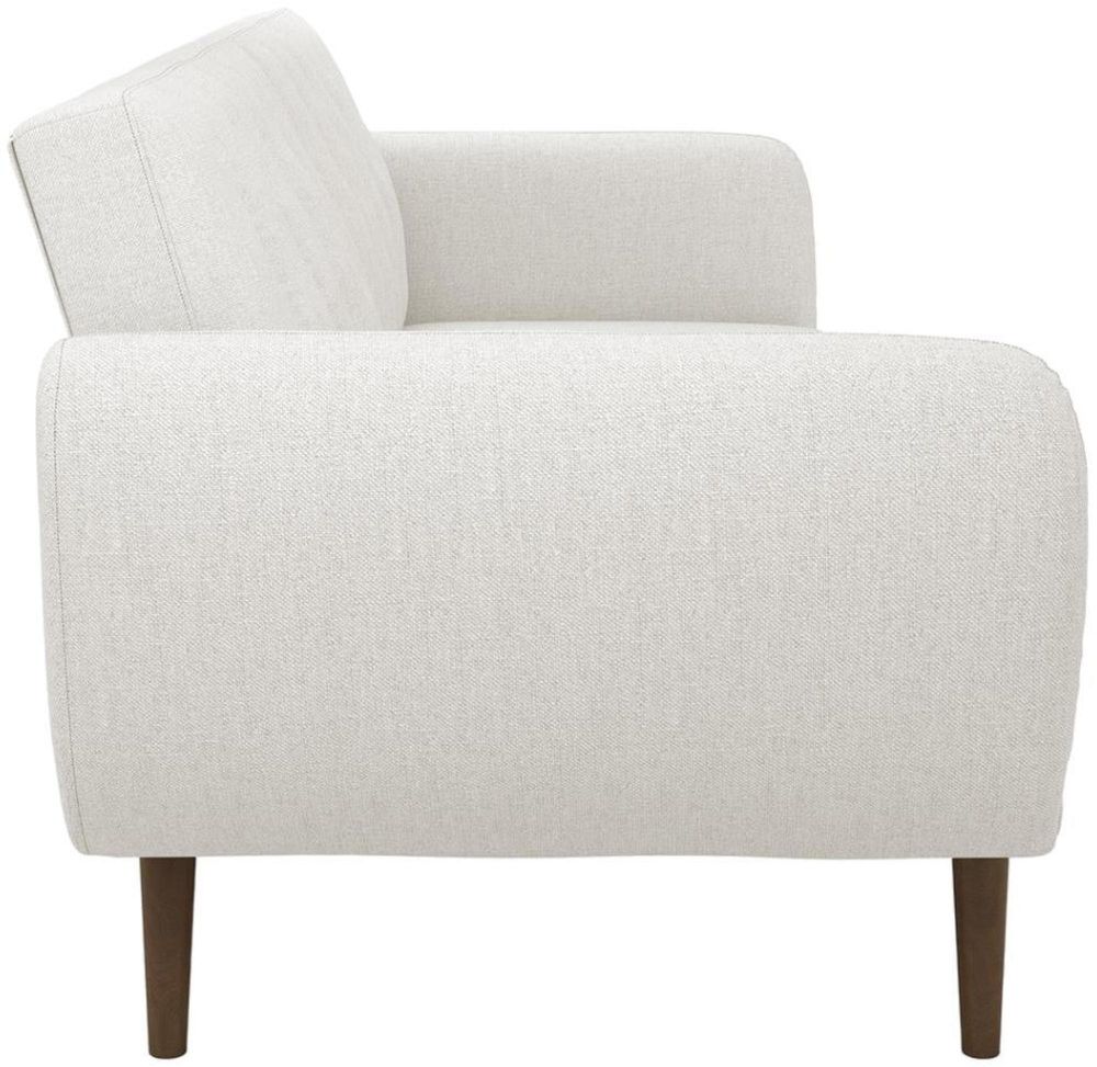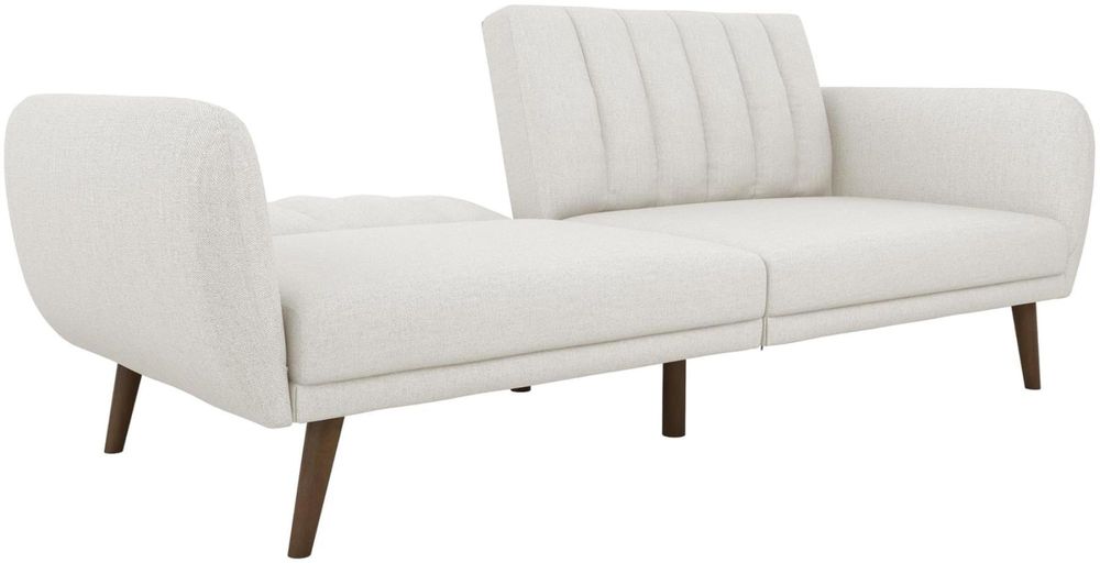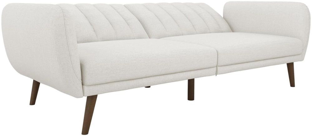Be embraced by the comfortable cushioning of the Nowata Brittany Futon. With its ribbed tufted cushioned back, the Nowata Brittany Futon gives your body all the support you need to sit and relax for hours. The combination of curved armrests and slanted legs work together to provide a unique rounded look that stands out. The stylish upholstery adds another element of elegance making this a perfect statement piece for any living space. Designed with a multi-position split-back, the Brittany independently converts between a sitting, lounging and sleeping position with an easy push and pull motion. The futon is also equipped with extra bag legs that provide extra support for your overnight guests when in a sleeping position. Available in multiple trendy colors that will either add a pop of color to your space or provide a neutral statemen piece to build your décor around. Pair with the rest of the Brittany collection to get the complete look!• Stylish linen upholstery wipes clean easily• Ribbed tufted cushioned back with slanted oak coloured wooden legs• Sturdy wood frame construction that is stable and durable• Comfortable polyester and foam filling
