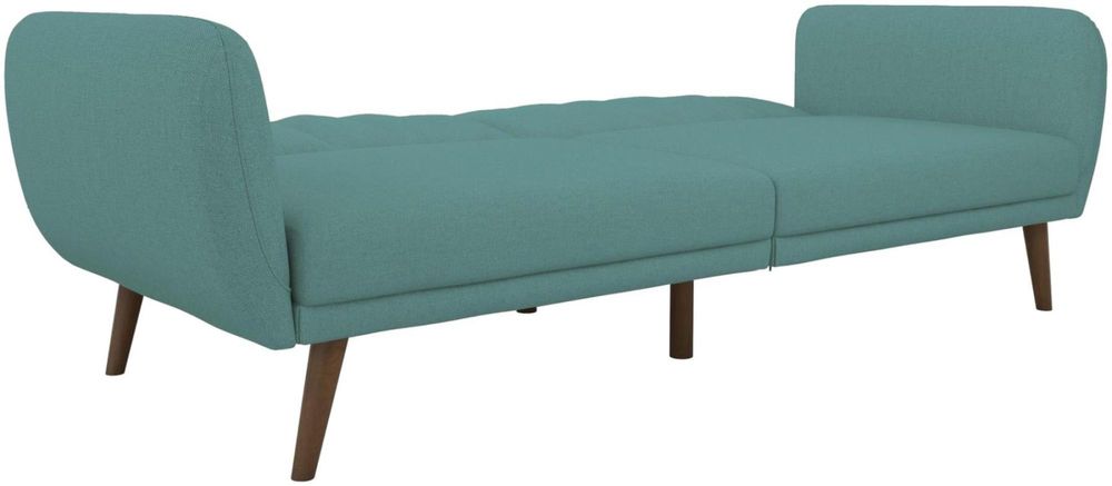 Be embraced by the comfortable cushioning of the Nowata Brittany Futon. With its ribbed tufted cushioned back, the Nowata Brittany Futon gives your body all the support you need to sit and relax for hours. The combination of curved armrests and slanted legs work together to provide a unique rounded look that stands out. The stylish upholstery adds another element of elegance making this a perfect statement piece for any living space. Designed with a multi-position split-back, the Brittany independently converts between a sitting, lounging and sleeping position with an easy push and pull motion. The futon is also equipped with extra bag legs that provide extra support for your overnight guests when in a sleeping position. Available in multiple trendy colors that will either add a pop of color to your space or provide a neutral statemen piece to build your décor around. Pair with the rest of the Brittany collection to get the complete look!• Stylish linen upholstery wipes clean easily• Ribbed tufted cushioned back with slanted oak coloured wooden legs• Sturdy wood frame construction that is stable and durable• Comfortable polyester and foam filling• Futon Dimensions: 81.5"L x 34.5"W x 31.5"H. Sleeper Dimensions: 70.5"L x 43.5"W x 16"H. Weight Limit: 600 lb.