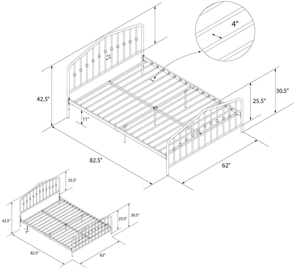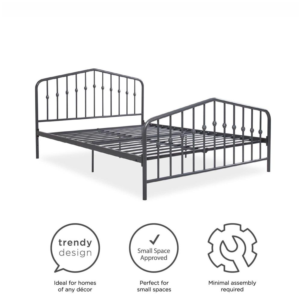 Get inspired to introduce fresh ideas into your bedroom to create a look that is both cozy and elegant. The Nowata Bushwick Metal Bed has a simple design that will perfectly complement rooms of any style and décor. With round finials featured on the headboard and footboard posts, its style and color can be easily combined with bold colors and accessories to brighten up the room. Complete with metal slats, side rails and center legs, this bed’s sturdy construction provides full support and comfort to the body and mattress. The metal slats remove the need for any additional box spring or foundation, while also providing your mattress with much needed support and breathability. For your convenience, the Nowata Bushwick Metal Bed has two base heights – 6" or 11" clearance, to give you the option to use the under bed space as extra storage space for seasonal clothing and accessories. Available in multiple sizes and colors, there is the perfect Bushwick for every home.• Industrial modern design. Headboard and footboard feature decorative round finial posts• Sturdy metal frame construction with metal side rails for guaranteed stability and durability• Center metal rail and legs for added support. Includes metal slats to provide support and comfort• 2 base height options for convenience: 6" or 11" clearance• Available in Full, Queen and King in multiple colors