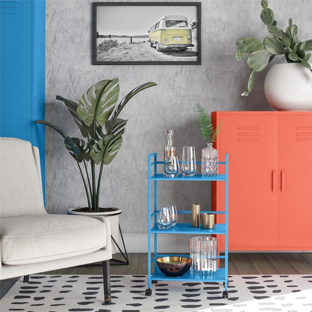 From the living room to the bathroom to the kitchen and beyond, the Nowata Cache Metal Rolling Cart is a great addition to your home. Featuring a minimalistic style, the Cart has 3 large shelves. Each shelf has 3 wrap-around bars and can hold up to 20 lbs. Place glasses, your favorite drinks, and decanter on the shelves for a stylish bar and serving cart or use as a craft cart or office cart to organize your printer, paper, and craft supplies. Easily roll the Cart from room to room on the 4 casters, 2 of which lock into place. The storage possibilities are endless with this versatile cart. Thanks to the blue powder-coated metal finish, this Cart will add a fun and funky pop of color to any space. The Cart ships flat to your door and requires assembly upon opening. Two adults are recommended to assemble. Once assembled, the Cart measures to be 30.11”H x 16.81”W x 11.4”D.