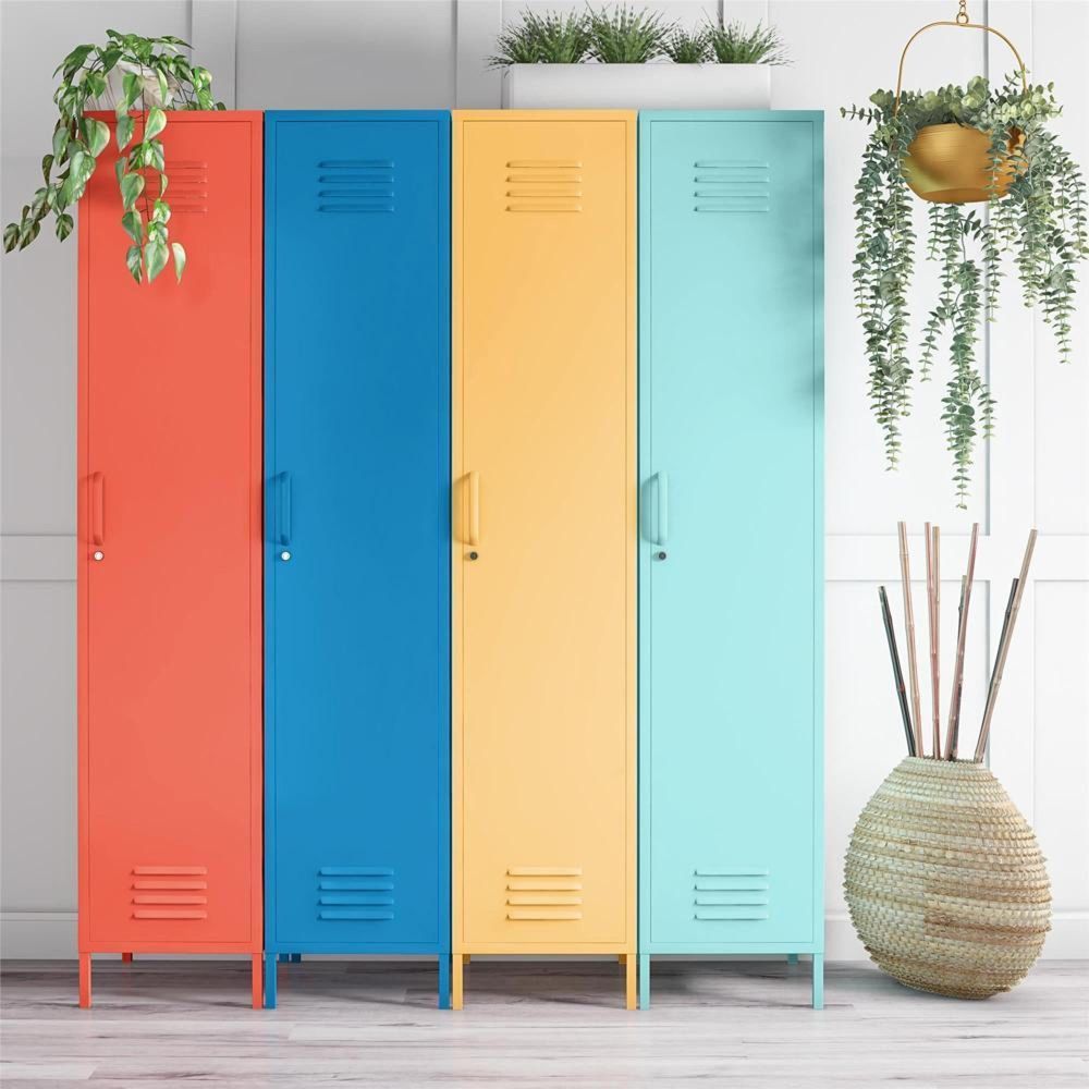 Add valuable storage and a fun pop of color anywhere in your home with the Nowata Cache Single Metal Locker Storage Cabinet. Made of powder-coated metal, the bright blue color adds a fun twist to your storage solution. The metal can easily be cleaned with a damp cloth so you can store anything from cleaning supplies, pantry items, or extra throws and board games. The 4 shelves provide plenty of space for storage no matter where you need it. The door features a lock so you can keep chemicals out of the reach of children. A wall anchor kit is included to secure the Cabinet to the wall. The Cabinet ships flat to your door and requires assembly upon opening. Two adults are recommended to assemble. Once assembled, the Cabinet measures to be 72.83”H x 14.96”W x 15.75”D.• Get the perfect storage solution for any room in your house with the Nowata Cache Single Metal Locker Storage Cabinet• Made of powder-coated metal, the bright blue color adds a fun pop of color while the metal makes it easy to clean spills with a damp cloth• The 4 shelves are ideal for storing away anything from cleaning supplies to kitchen pantry items. The door features a lock to keep your items secure and away from children• A wall anchor kit is included to secure the Cabinet to the wall and prevent tipping injuries• The Cabinet ships flat to your door and 2 adults are recommended to assemble. Each shelf can hold up to 15 lbs. Assembled dimensions: 72.83”H x 14.96”W x 15.75”D