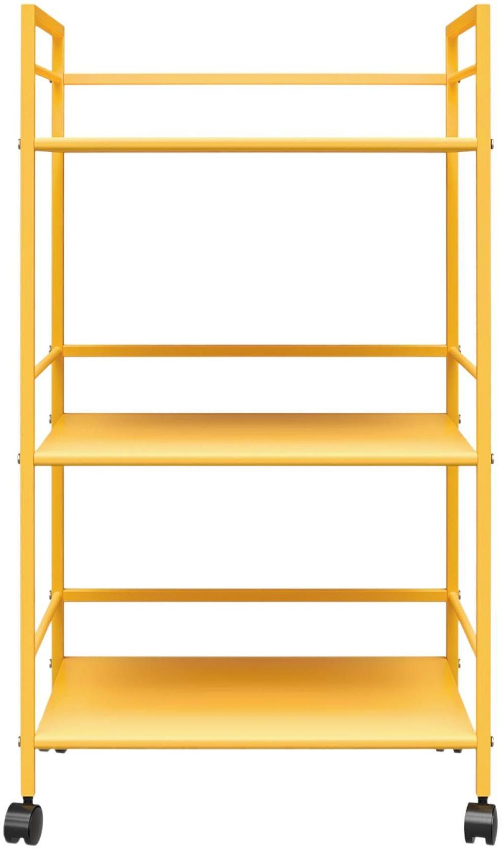 From the living room to the bathroom to the kitchen and beyond, the Nowata Cache Metal Rolling Cart is a great addition to your home. Featuring a minimalistic style, the Cart has 3 large shelves. Each shelf has 3 wrap-around bars and can hold up to 20 lbs. Place glasses, your favorite drinks, and decanter on the shelves for a stylish bar and serving cart or use as a craft cart or office cart to organize your printer, paper, and craft supplies. Easily roll the Cart from room to room on the 4 casters, 2 of which lock into place. The storage possibilities are endless with this versatile cart. Thanks to the yellow powder-coated metal finish, this Cart will add a fun and funky pop of color to any space. The Cart ships flat to your door and requires assembly upon opening. Two adults are recommended to assemble. Once assembled, the Cart measures to be 30.11”H x 16.81”W x 11.4”D.
