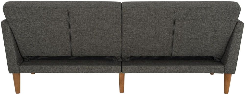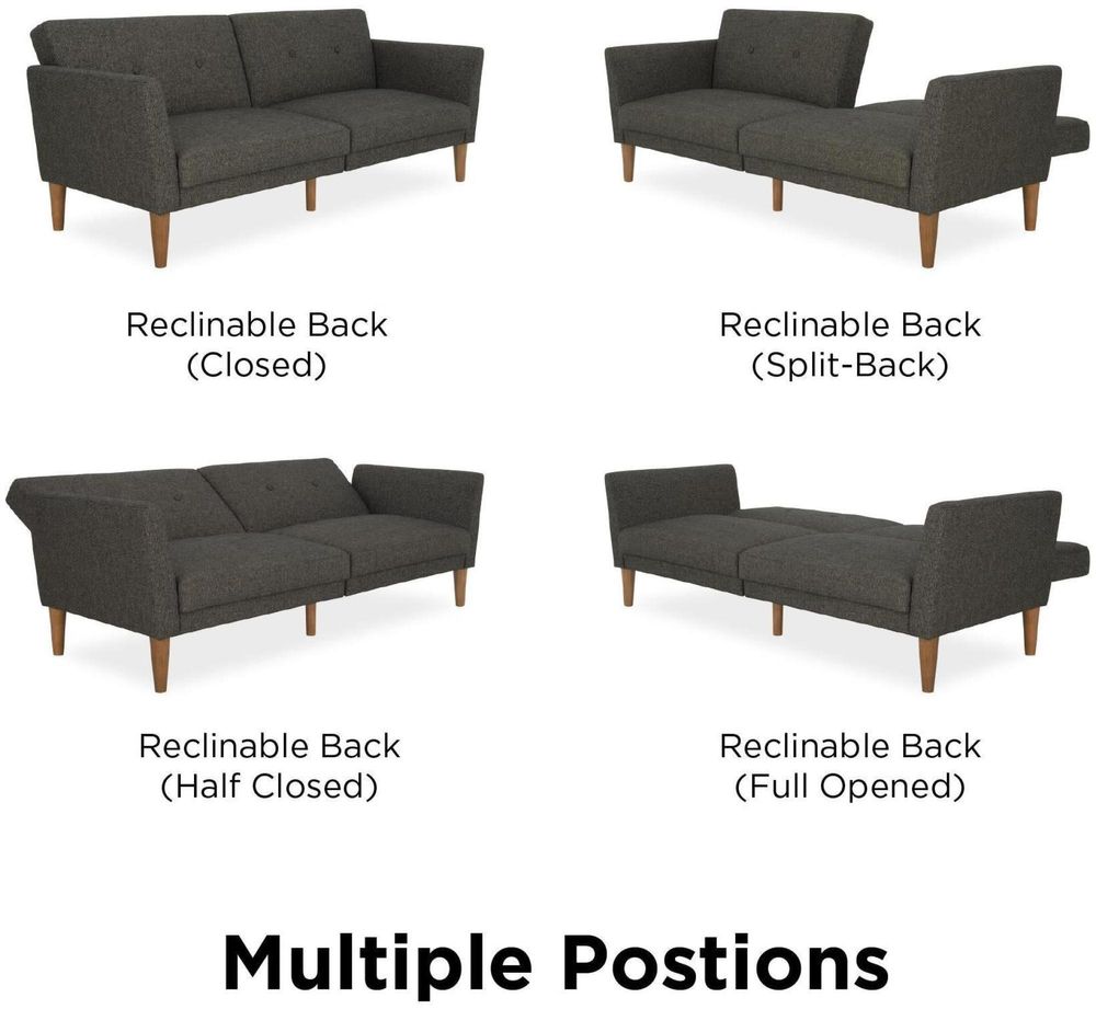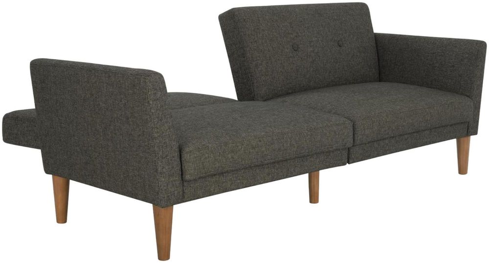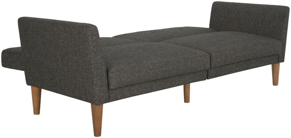 The 1950s are back in a big way, and living rooms across the country are being given a modern twist on the mid-century look that made straight lines and low profiles so popular. The Nowata futon captures all that and more, with grey linen upholstery, a tufted back, wide winged arms, sleek style, and a wood frame that offers full support. The wood legs round off the look, with extra center legs that provide extra stability. You can also personalize your comfort level thanks to the split back, which allows you and a guest to each sit up or lounge back. Or simply open the Nowata up into a sleeper sofa for overnight guests to spend the night. We’ve also added padding under the feet to protect your floors. Just add the Nowata ottoman to really complete the look!• Linen upholstery with tufted back and winged arms• Sturdy wood frame with stylish wood legs and padding under the feet to protect your floors from scuffs and scratches• Multi-functional piece ideal for small living spaces. Split back design provides multiple positions of comfort• Converts quickly and easily into a lounger and sleeper• Wipes clean quickly