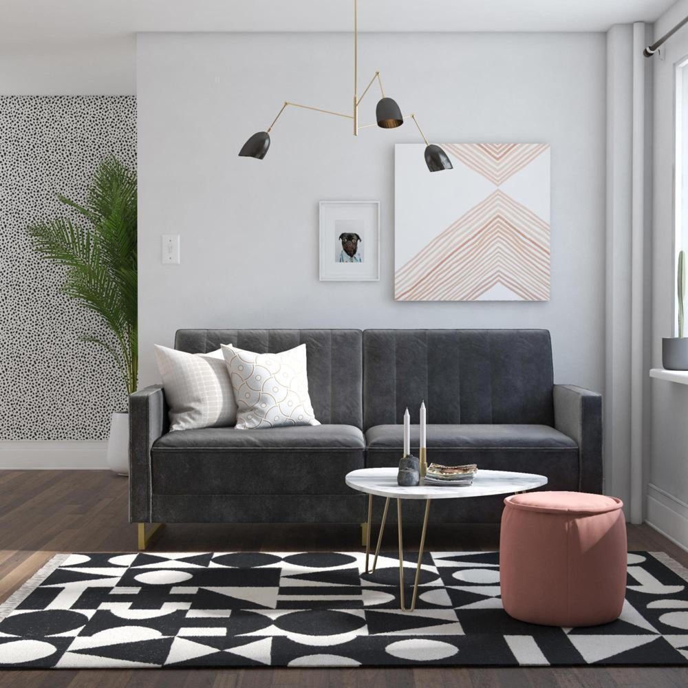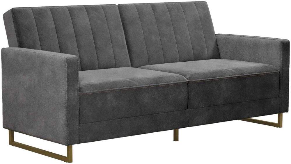 The Nowata Skylar Coil Futon stands out from the rest and makes a statement! Modern and trendy, the futon is designed with a ribbed tufted cushioned back that features vertical stitching details in the backrest. The Skylar is upholstered in rich velvet and sits on trendy gold powder coated metal legs to add a touch of modern glam to your room décor. This upholstered futon is constructed with pocket coil seating to offer optimal comfort for you and your guests during a movie night. This versatile futon is also the perfect solution for accommodating overnight guests as its multi-functional split-back design allows you to independently recline the backrest between three positions: sitting, lounging and sleeping. Available in a variety of colors, the Nowata Skylar Coil Futon is a great option if you want a piece that will instantaneously add functionality and personality to your home. What are you waiting for?• Modern design fully upholstered in rich velvet with ribbed tufted cushioned back and gold powder coated metal legs.• Pocket coil seating to offer optimal comfort for movie watching or hosting overnight guests.• Multi-functional split-back design allows you to independently recline the backrest between three positions: sitting, lounging and sleeping.• Ships in one box and assembles quickly.• Product dimensions: Sofa – 77”L x 33.5”W x 33”H. Bed – 70”L x 44”W x 17.5”H. Weight limit: 600 lbs. Shipping dimensions: 44”L x 36”W x 18”H. Net weight: 104 lbs. Gross weight: 117 lbs.