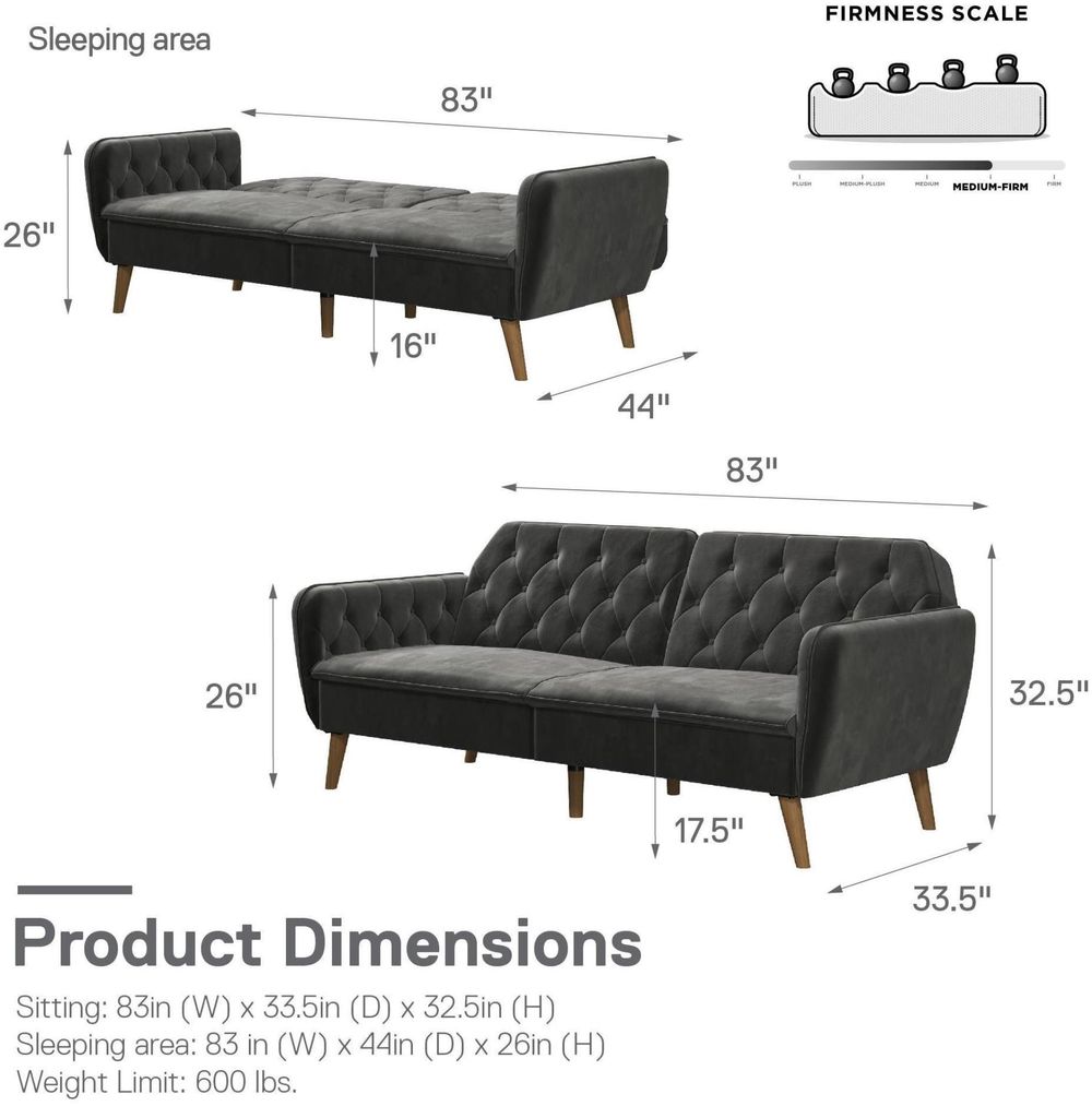 The Nowata Tallulah Memory Foam Futon is exactly what you need and more! Bringing elegance and sophistication into your home with its vintage silhouette, rounded lines and button-tufted details. Designed with a soft velvet upholstery, this piece of furniture is both compact and multi-functional. Made with a sturdy wood frame, the Tallulah Memory Foam Futon is designed to offer nothing but superior comfort! The seat cushions are filled with high-density foam and responsive memory foam that will cradle your body to help relieve pressure points while you are watching TV or taking a much needed afternoon nap. The backrest features a split-back design that can be independently reclined to convert between multiple positions: sitting, lounging and sleeping. In other words, this means that you will now have an extra bed for overnight guests! Available in multiple colors, the Nowata Tallulah Memory Foam Futon is finished with slanted wooden legs to add a last touch of chic style!• Classic vintage design in velvet upholstery with button-tufted arms and back and wooden legs• Made on a sturdy wood frame with filling made of high-density foam and memory foam for ultimate comfort• Multi-functional design. The back can be reclined to lounging and sleeping position• Available in blue, grey, green and pink velvet. Ships in one box and it is easy to assemble• Futon dimensions: 83”L x 33.5”W x 32.5”H. Sleeping dimensions: 73”L x 44”W x 17.5”H. Weight limit: 600 lb.