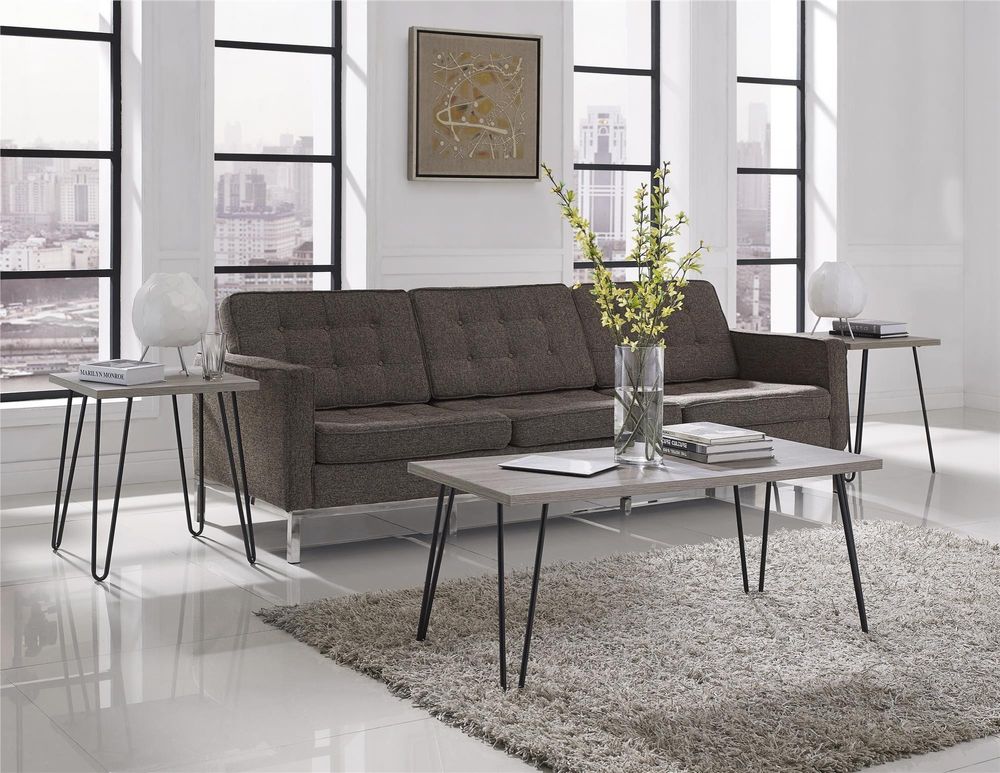 Create a throwback look with the Ameriwood Home Obion Retro End Table. Crafted with a mid-century design, the gunmetal-gray hairpin-style legs offer an industrial feel. At the same time, the distressed oak finish of the tabletop is both charming and rustic, allowing this piece to fit in with modern and transitional styles. Compact yet sleek, this 21.85"h x 19.5"w x 19.5"d end table can support up to 20 lbs. and is ideal for small to medium-sized rooms. Made from laminated particleboard, the table requires minimal assembly – all you have to do is attach the 4 powder-coated legs.• Add style to your living room, dining room, kitchen or bedroom with the Ameriwood Home Obion End Table• Slim and compact, it fits perfectly in small rooms and can hold up to 20 lbs• Minimal assembly required. Dimensions: 21.85"h x 19.5"w x 19.5"d. Shipping weight is approximately 18.35 lbs• Gray hairpin-style legs accent the brown oak table surface• This table is made from laminated particleboard with powder-coated metal legs