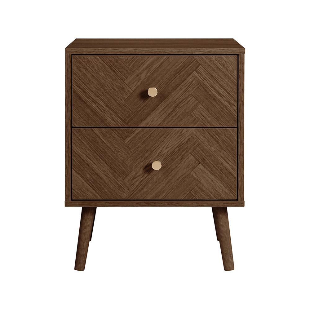 Item Code: HER2BSWAL Inspired by the symmetry and precision of classic chevron patterns, the Herringford range brings an element of architectural finesse to your bedroom. Each piece is thoughtfully constructed from high-quality particleboard, finished with a laminated walnut effect that captures the essence and visual warmth of real wood.The Herringford 2 Drawer Bedside table offers a blend of aesthetic charm and practicality, its design resonating with the sleek, modern appeal of the entire range.Transform your bedroom into a sanctuary of ordered beauty with the Herringford range. This collection is perfect for creating a serene retreat with its cohesive design that speaks to both contemporary tastes and classic sensibilities. Embrace the blend of modernity and tradition with the Herringford range where every piece is not just furniture but a piece of art. Each piece is thoughtfully constructed from high-quality particleboard, finished with a laminated walnut effect that captures the essence and visual warmth of real wood.