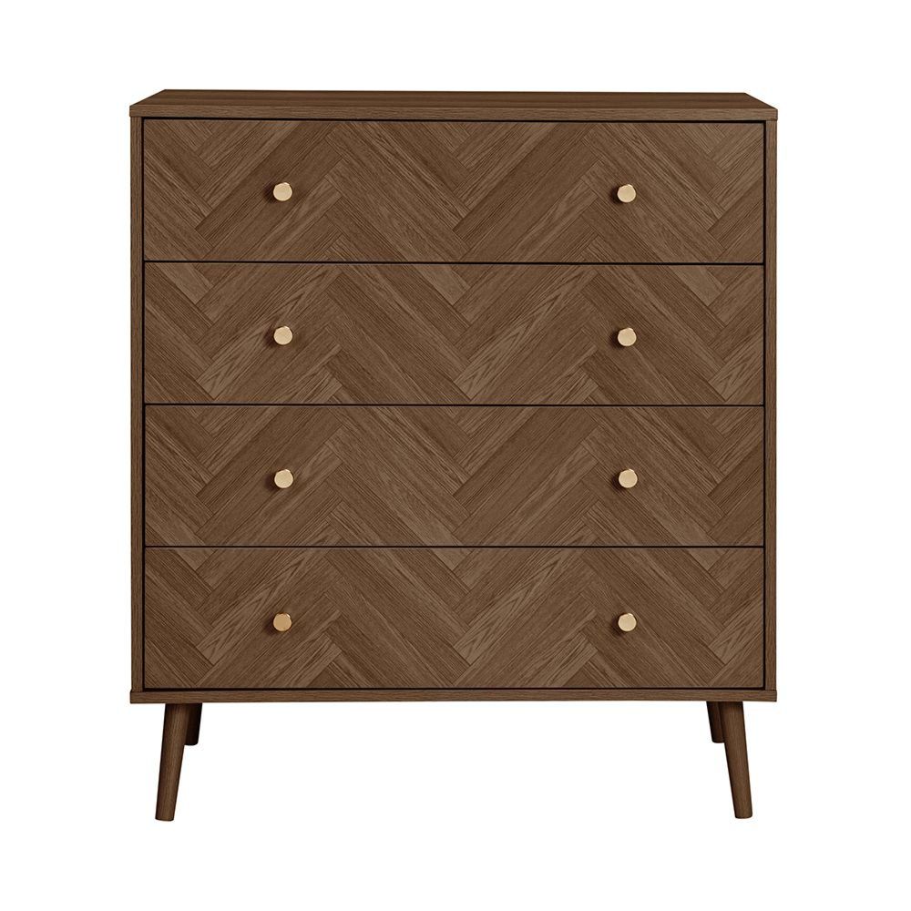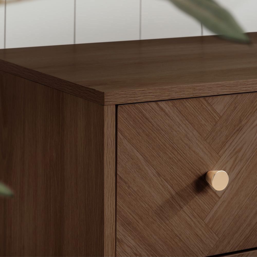 Item Code: HER4CHWAL Inspired by the symmetry and precision of classic chevron patterns, the Herringford range brings an element of architectural finesse to your bedroom. Each piece is thoughtfully constructed from high-quality particleboard, finished with a laminated walnut effect that captures the essence and visual warmth of real wood.The Herringford 4 drawer chest is a distinctive storage solution that perfectly captures the range's fusion of functional design and contemporary style. This elegant piece features two smaller drawers at the top, ideal for organising smaller items, and three larger drawers below, providing ample space for clothing and linens.Transform your bedroom into a sanctuary of ordered beauty with the Herringford range. This collection is perfect for creating a serene retreat with its cohesive design that speaks to both contemporary tastes and classic sensibilities. Embrace the blend of modernity and tradition with the Herringford range where every piece is not just furniture but a piece of art. Each piece is thoughtfully constructed from high-quality particleboard, finished with a laminated walnut effect that captures the essence and visual warmth of real wood.