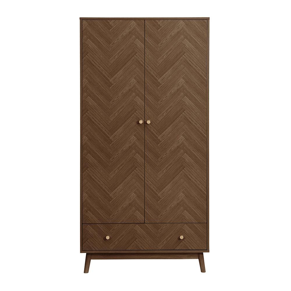 Item Code: HERWD21WAL Inspired by the symmetry and precision of classic chevron patterns, the Herringford range brings an element of architectural finesse to your bedroom. Each piece is thoughtfully constructed from high-quality particleboard, finished with a laminated walnut effect that captures the essence and visual warmth of real wood.The Herringford 2 Door 1 Drawer Wardrobe expertly combines compact design with ample storage capabilities, making it a superb choice for contemporary living spaces. This functional piece features two doors that open to reveal a spacious hanging area.Transform your bedroom into a sanctuary of ordered beauty with the Herringford range. This collection is perfect for creating a serene retreat with its cohesive design that speaks to both contemporary tastes and classic sensibilities. Embrace the blend of modernity and tradition with the Herringford range where every piece is not just furniture but a piece of art. Each piece is thoughtfully constructed from high-quality particleboard, finished with a laminated walnut effect that captures the essence and visual warmth of real wood.