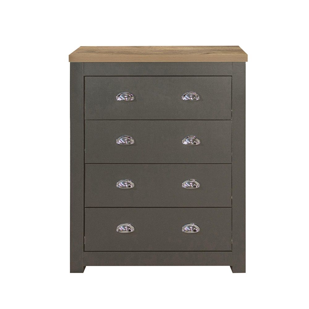 Item Code: HIG4CHDGOK Inspired by classic farmhouse furniture the Highgate range has been designed to complement both modern and traditional homes. The Highgate range is modern, practical, affordable furniture and with stylish silver handles looks fantastic too. Available in cream & oak, grey & oak and navy & oak this range will suite a wide array of interiors.The Highgate 4 drawer chest features 4 spacious drawers and is finished off with contemporary silver cup handles.Care instructions: Wipe carefully with a soft, dry cloth.