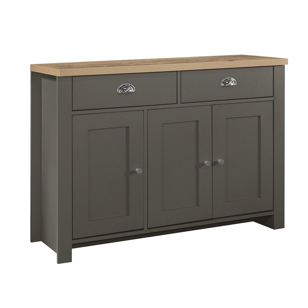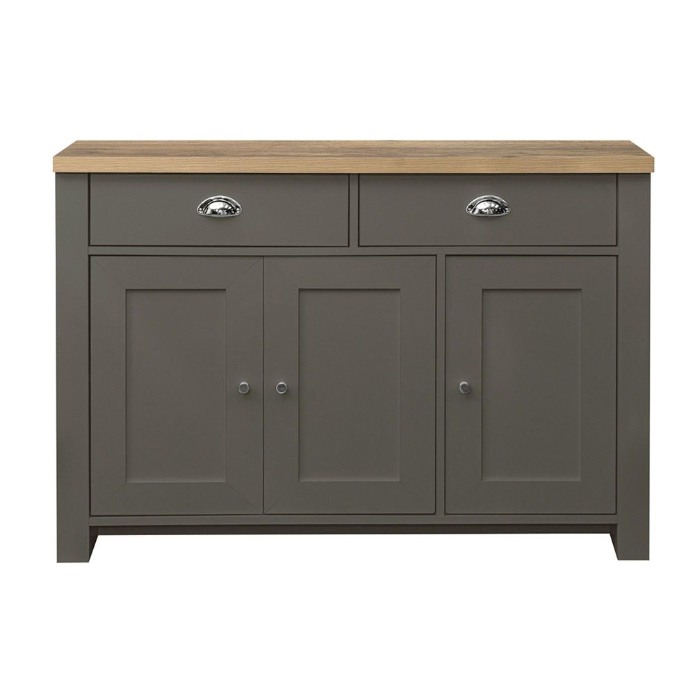 Item Code: HIG23SBDGOK Inspired by classic farmhouse furniture the Highgate range has been designed to complement both modern and traditional homes. The Highgate range is modern, practical, affordable furniture and with stylish silver handles looks fantastic too. Available in cream & oak, grey & oak and navy & oak this range will suite a wide array of interiors.An elegant storage solution for the living or dining room, this Highgate 3 Door 2 Drawer Sideboard is a great way to keep your home looking neat and tidy. Featuring 4 compartment area's making it ideal for both small and large items. The drawers are finished off with silver cup and square handles.Care instructions: Wipe carefully with a soft, dry cloth.