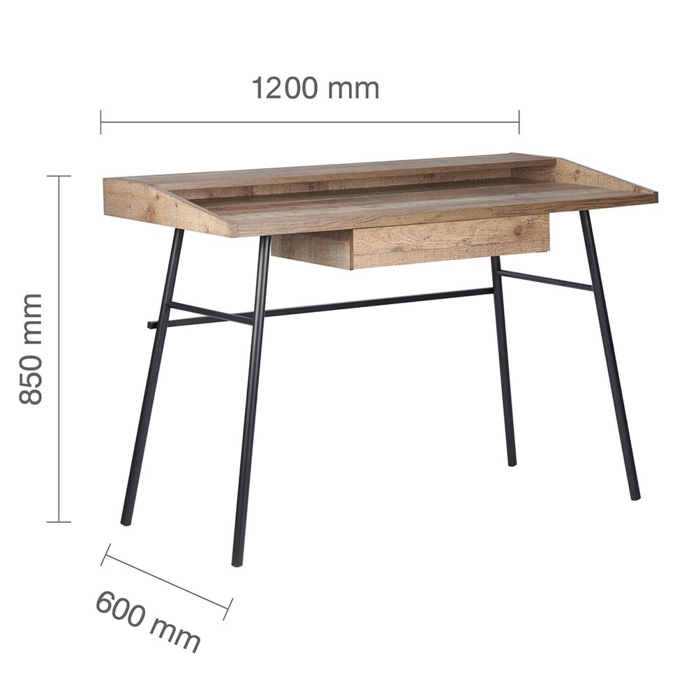 Item Code: URB1DODSRUS Our Urban range radiates industrial chic. The Urban 1 Drawer Office desk with shelf provides ample work area for a home office and features 1 hidden drawer for for paperwork. Crafted from a metal frame with industrial effect detail and features a wood-effect finish, the simple lines and subtle industrial style will give a contemporary twist to the focal point of any office. Care instructions: Wipe carefully with a soft, dry cloth.