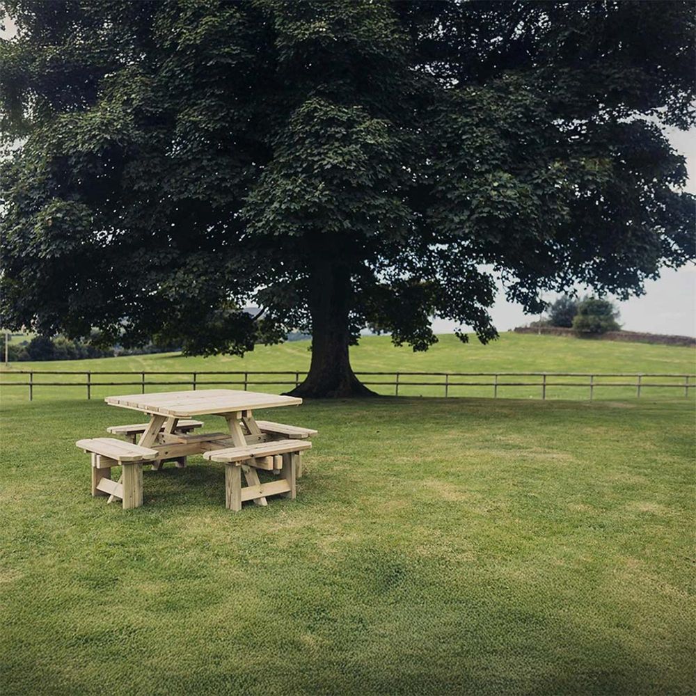 Our square picnic table is a solid addition to our range of excellent outdoor dining options. A change from the ‘norm’, this picnic table generously seats 8 adults in a sociable face to face configuration.
