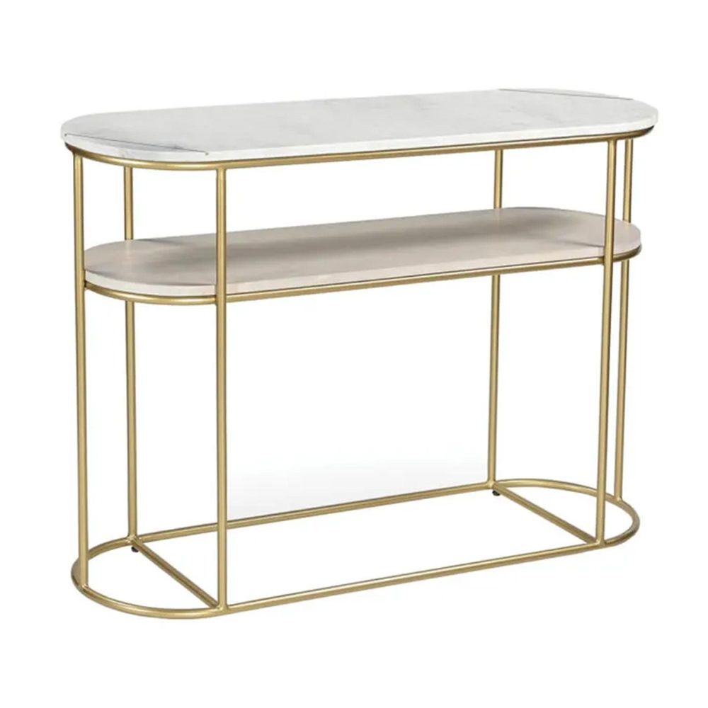 Elevate your living room with the Buxton White Marble and Gold Oval Console Table, bringing a touch of modern luxury. Designed with a balance of sleek aesthetics and functional design, this console table is a true statement piece for refined interiors.