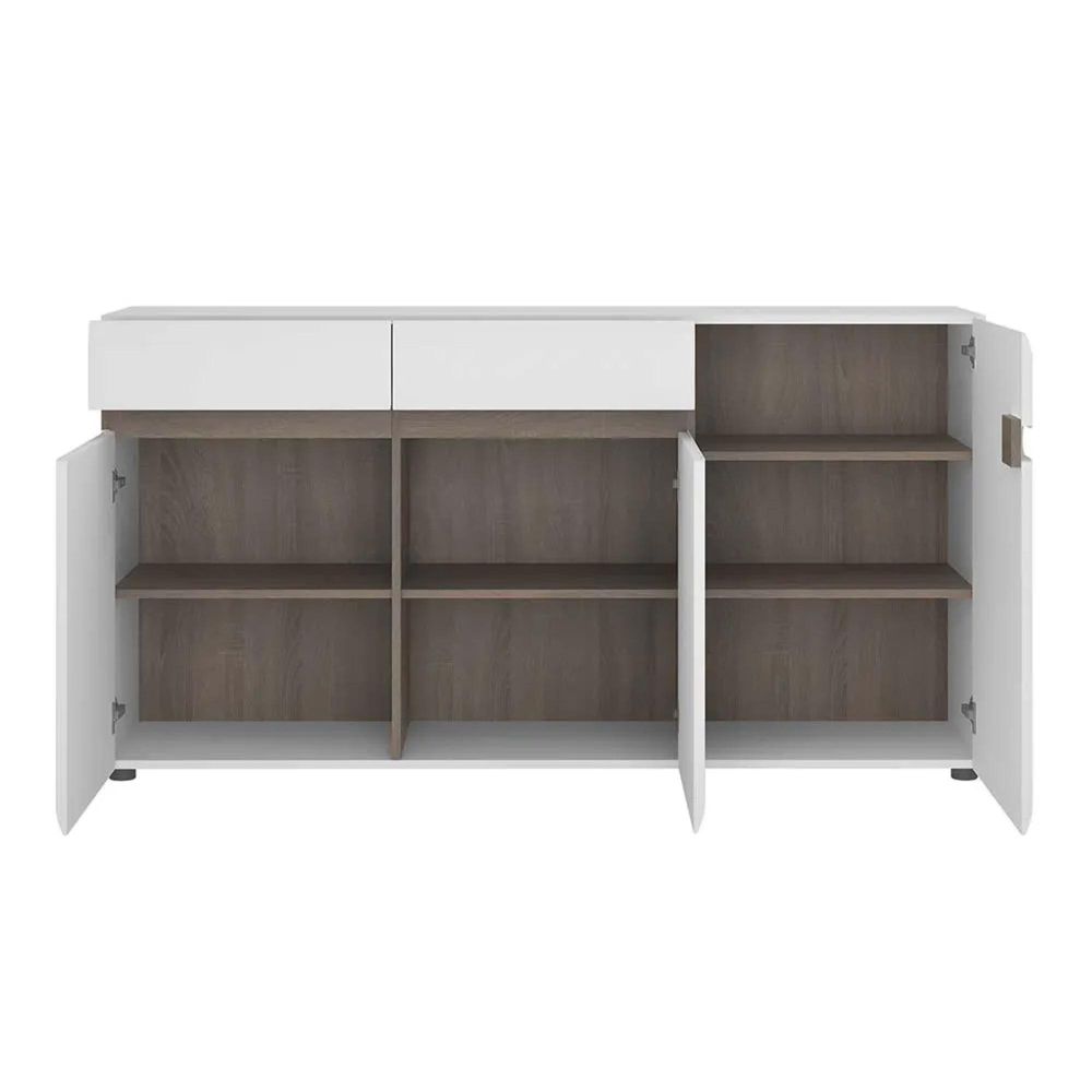 Item Code: 4024044 This item is listed as clearance and available on first come first serve basis once ordered can not be cancelled2 drawer 3 door sideboard in white with an Truffle Oak trim. Unconventional design - a proposal for the followers of the latest trends. The clever mix of scratch resistant white melamine with beautiful high gloss fronts and oak melamine trim makes this top quality collection of furniture the ideal destination for the most modern of homes, the massive range that includes many cabinets and wall units fulfils every storage and display option.
