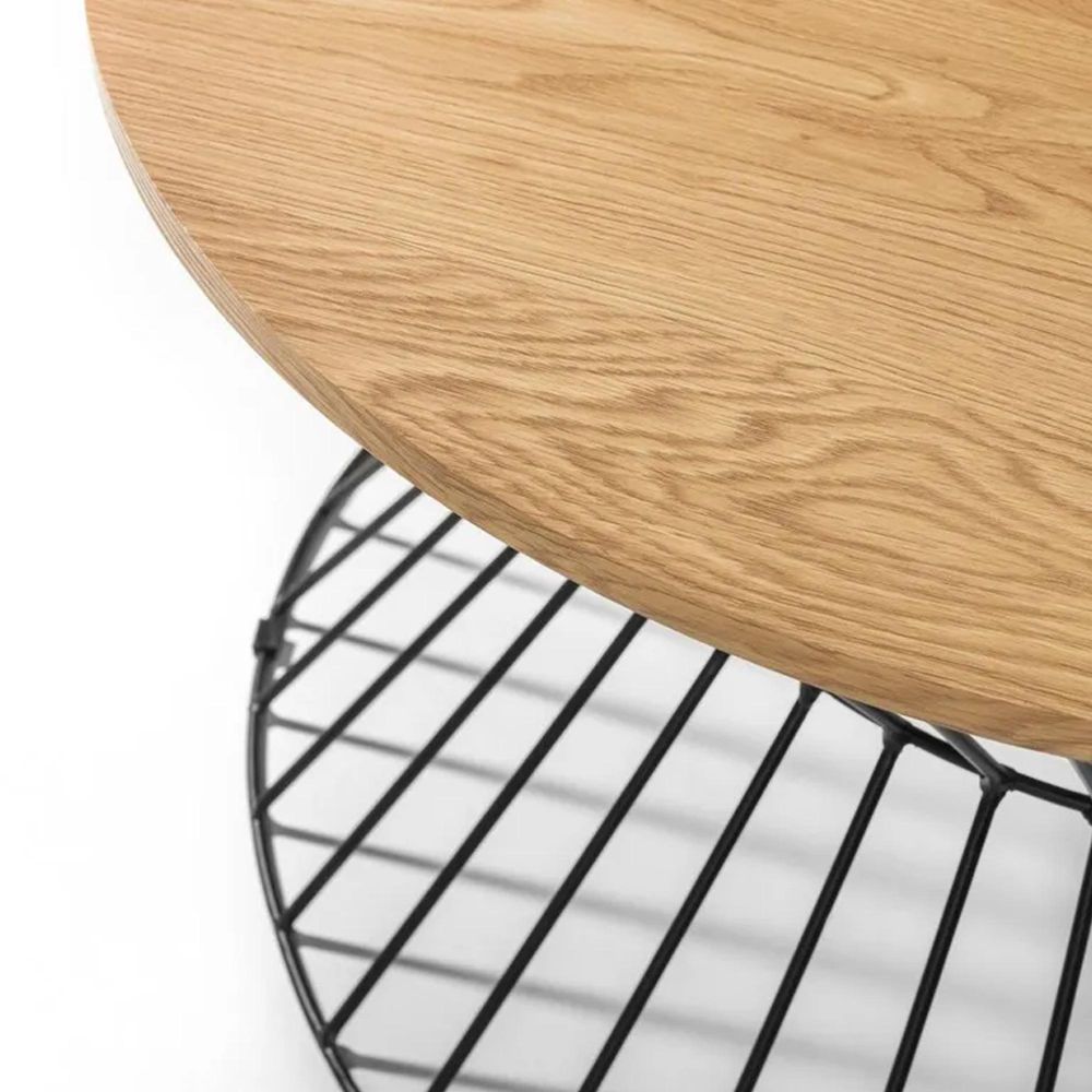 Item Code: JER003 The Jersey Coffee Table will add a contemporary addition to any living area. Featuring a black wire frame with a fixed round oak effect top, this coffee table creates a striking industrial feel with a classic contrast.