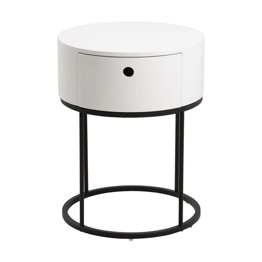 Item Code: 102923 Polo round bedside table, top, frame and drawer white PU painted MDF, base matt black rough powder coated steel. A discreet bedside table offering both style and storage. The round shape and minimalistic form make this table perfect for any bedroom. It does not take up too much space in the room and features a drawer for those items you wish to keep out of sight. The painted white top is supported by a powder coated steel base that creates a contrasting look.Free Delivery