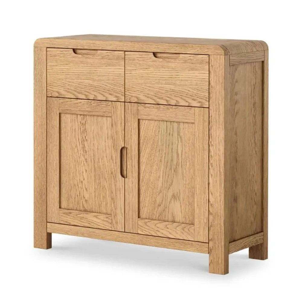 The Thurlestone Curved Oak 2 Door Small Sideboard combines elegant design with practical storage, making it an ideal addition to any living or dining space. Its gently curved edges and recessed handles create a refined, contemporary look while keeping the overall design clean and sophisticated.