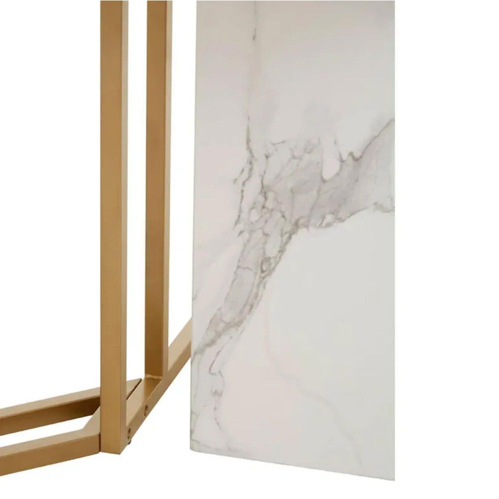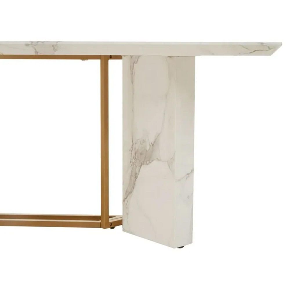 Item Code: 5528599 Vieste rectangular white marble effect dining table with gold powder legs.This dining table will make a dramatic statement with its sculptural base in luxe and soft accents.