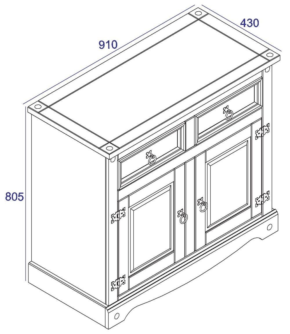 Item Code: CRG915 This sideboard is perfect for any home with its stylish, Mexican pine finish and grey accents. With two large compartments and two wide drawers, it offers plenty of storage space for all your belongings. Flat packed for easy assembly, it will make a great addition to any living or dining space.