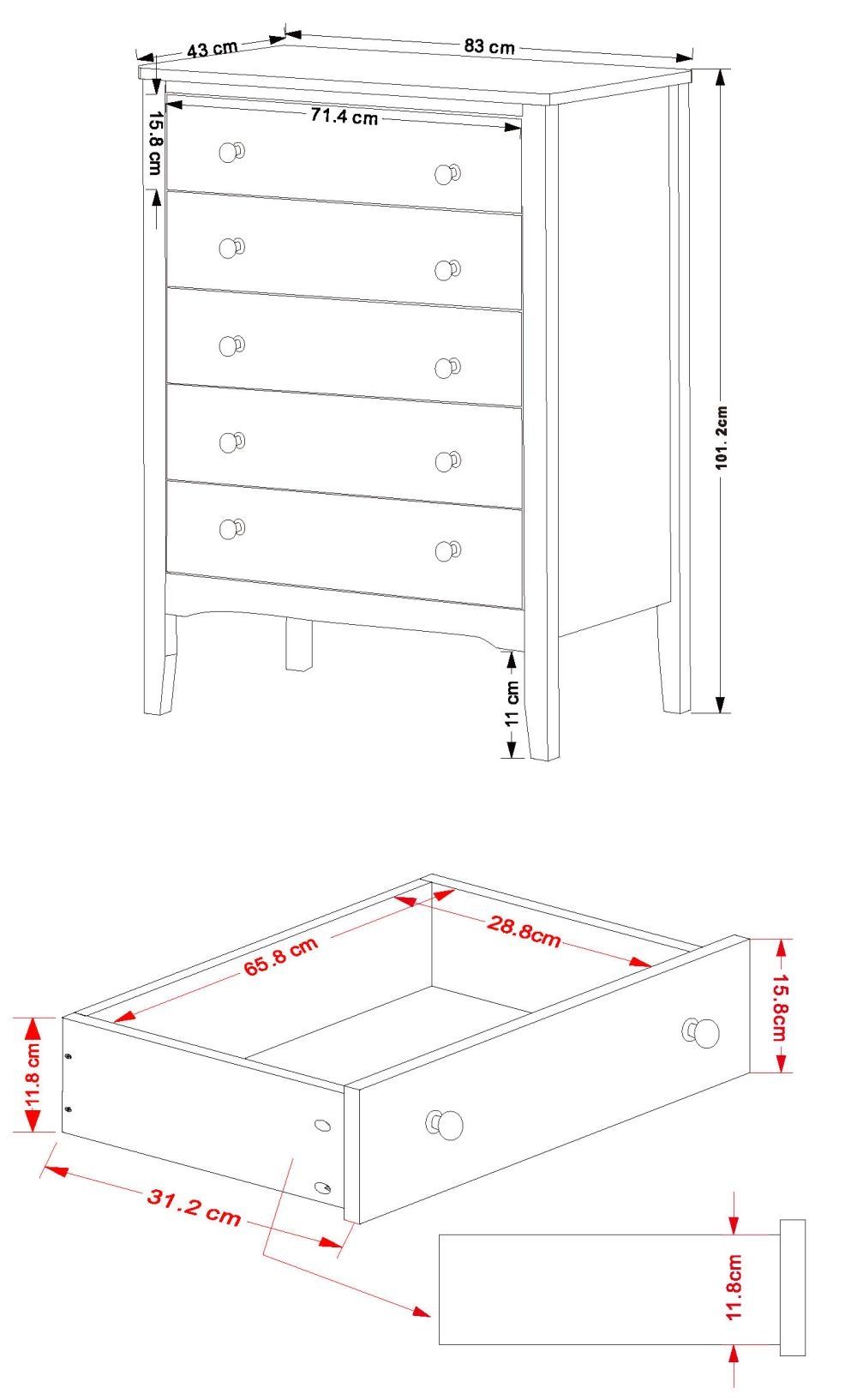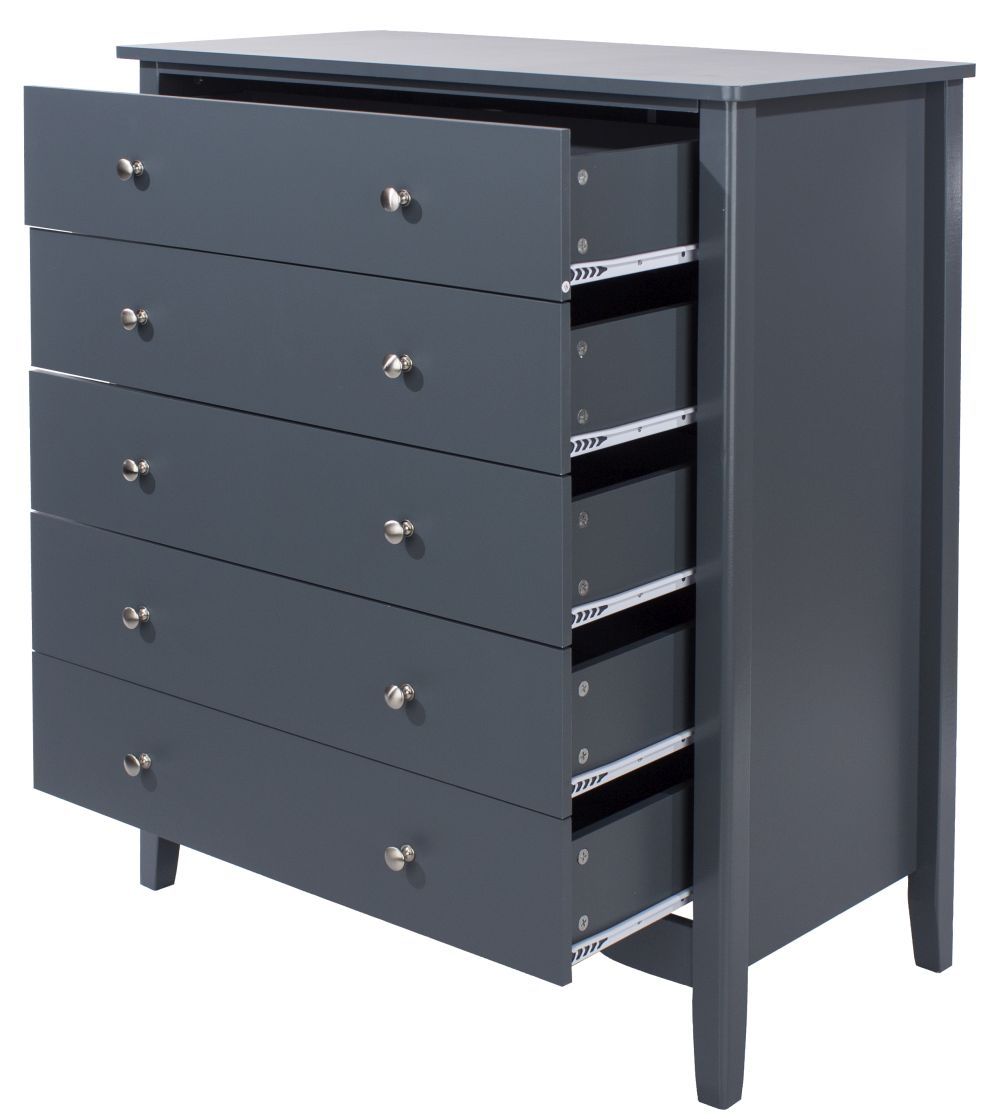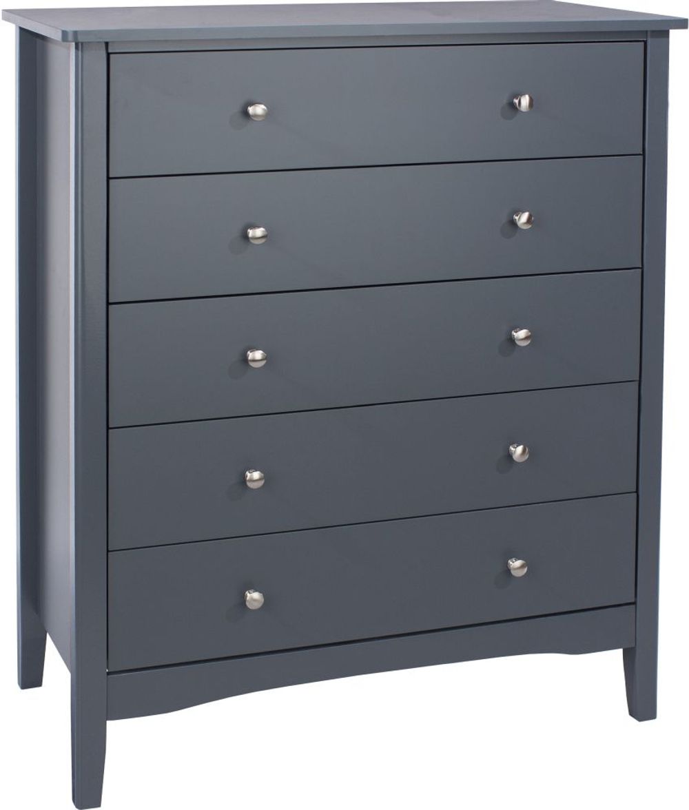 Item Code: CMB515 This chest is the perfect addition to any room. With five drawers, it provides plenty of storage space and is made of sturdy, durable materials. The dark blue finish will bring a modern touch to any decor. It ships flat packed and is easy to assemble. Ideal for any bedroom or living room.