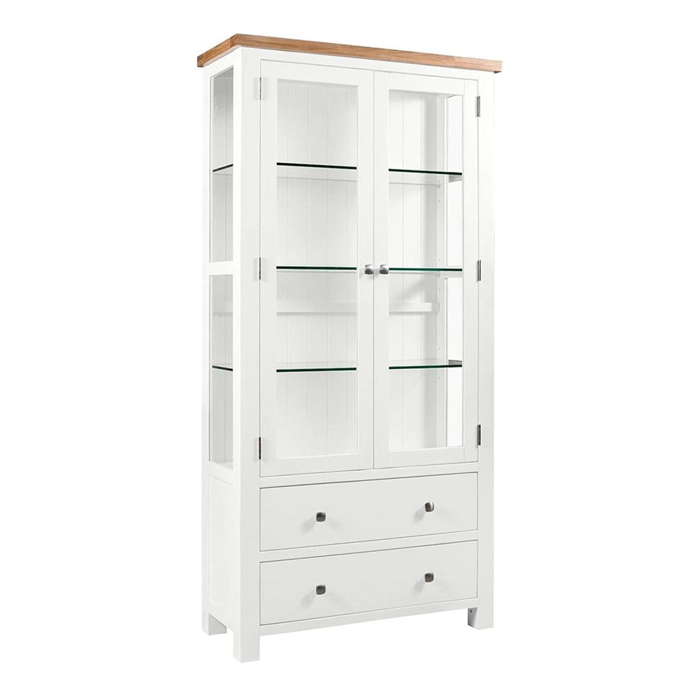 The Lundy 2 Door Display Cabinet is a beautifully crafted piece that combines elegant design with practical functionality. Featuring a clean white painted finish paired with a light oak lacquered top, this cabinet brings a bright and sophisticated touch to any room, whether traditional or modern.