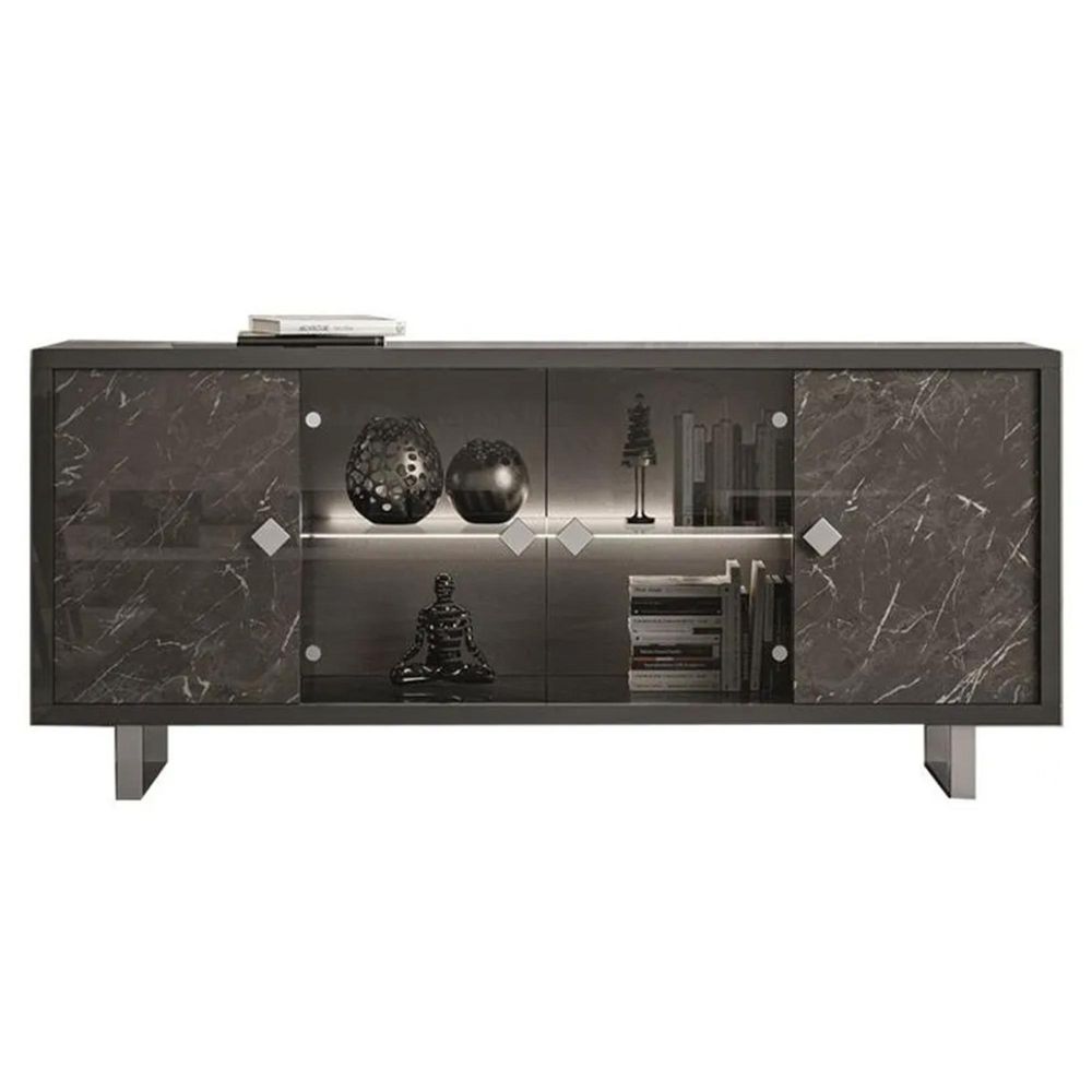 Item Code: 3021 Carvelle dining room is an elegant composition with a strong style for your dining room furnishing. The table, in glossy lacquered grey, is an extendable model with a glossy lacquered marble top and supported by thin mighty square legs with a matt chrome finish structure. The chairs are available in the lively version with quilted striped blue upholstery or in the precious grey version with checkered stitching pattern on back.With a design similar to the table, there are coffee tables and lamp tables as accessories of great charm and utility combined with the sofa. In front of the latter, the composition has a practical TV stand with doors and shelves for any extra space.aThe composition is completed by showcases with 1 or 2 doors, with matt chrome finish knobs and LED lights along the internal glass shelves and the 3 or 4-door sideboard, also equipped with bright LED installations.This is a Made to Order itemAll Made to Order items are manufactured as per the order supplied by you.We are unable to accept cancellation or accept any extra cost that may incur due to wrong information provided by you at the time you placed the order.We will confirm all sizes/colours/finishes in written email (order confirmation) with you before going ahead with production of your order.