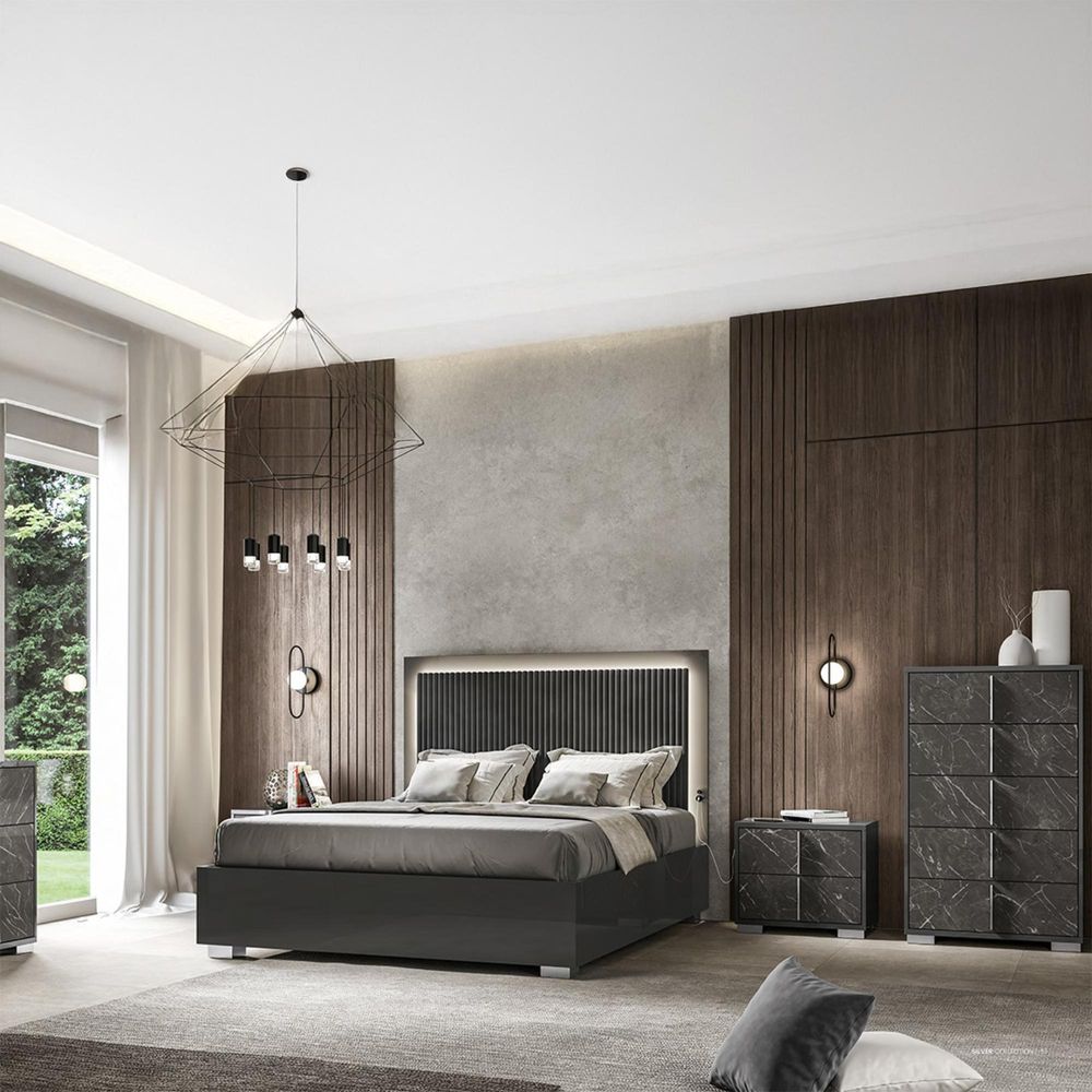Item Code: 3009 The Carvelle bedroom is a fascinating collection that will bring an atmosphere of refined and dreamy elegance to your bedroom.The bed catches the eye thanks to its imposing headboard (130 cm) with quilted striped padding, available in blue or gray, and LED lights that frame it.All made in glossy varnished gray, Carvelle presents on the fronts of all the drawers and in the wardrobe doors a refined marbled glossy varnished finish and vertical handles with matt chrome finish. Dresser , bedside tables and tallboy have cushioned guides and together with the bed are supported by feet in matt chrome finish.The wardrobe , modular model , is shown in the photo in its 4-door version with external mirrors.This is a Made to Order itemAll Made to Order items are manufactured as per the order supplied by you.We are unable to accept cancellation or accept any extra cost that may incur due to wrong information provided by you at the time you placed the order.We will confirm all sizes/colours/finishes in written email (order confirmation) with you before going ahead with production of your order.