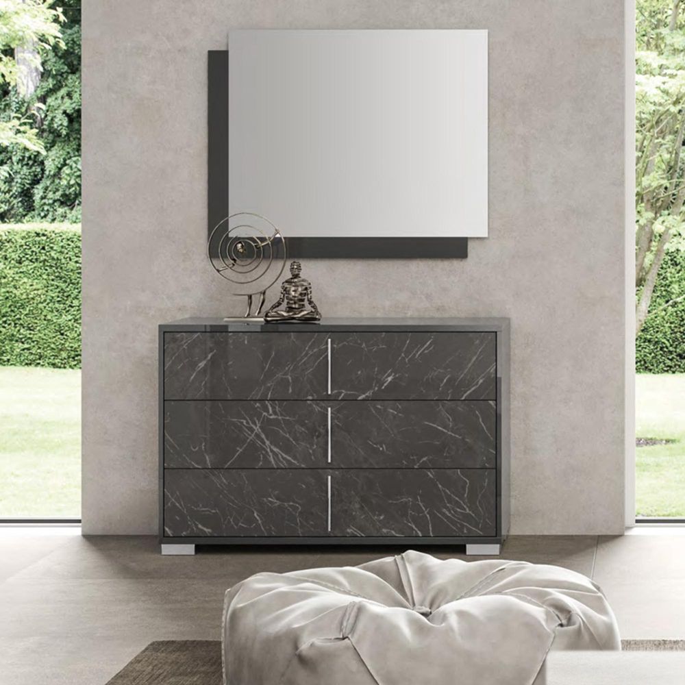 Item Code: 3003 The Carvelle bedroom is a fascinating collection that will bring an atmosphere of refined and dreamy elegance to your bedroom.The bed catches the eye thanks to its imposing headboard (130 cm) with quilted striped padding, available in blue or gray, and LED lights that frame it.All made in glossy varnished gray, Carvelle presents on the fronts of all the drawers and in the wardrobe doors a refined marbled glossy varnished finish and vertical handles with matt chrome finish. Dresser , bedside tables and tallboy have cushioned guides and together with the bed are supported by feet in matt chrome finish.The wardrobe , modular model , is shown in the photo in its 4-door version with external mirrors.This is a Made to Order itemAll Made to Order items are manufactured as per the order supplied by you.We are unable to accept cancellation or accept any extra cost that may incur due to wrong information provided by you at the time you placed the order.We will confirm all sizes/colours/finishes in written email (order confirmation) with you before going ahead with production of your order.
